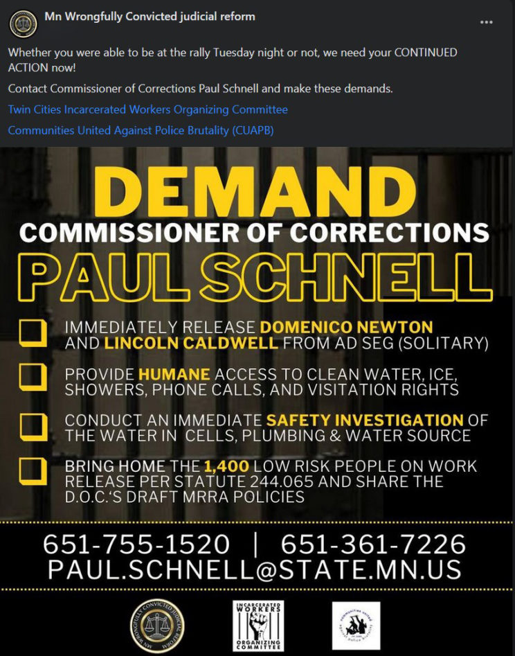 “Immediately release Domenico Newton and Lincoln Caldwell from Ad-Seg (solitary); provide humane access to clean water, ice, showers, phone calls, and visitation rights; conduct an immediate safety investigation of the water in cells, plumbing and water source; and bring home the 1,400 low risk people on work release per statute 244.065 and share the DOC’s draft MRRA policies.”