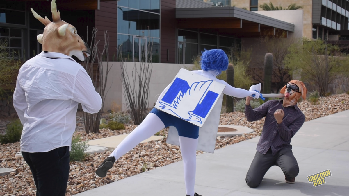 Scottsdale, AZ — “I’m here in an official capacity, representing Nationwide,” said a protester in a blue wig and a skintight blue acrylic body suit. She wore placards strung across her shoulders with hand-painted replicas of the Nationwide logo on the front and back of her body.