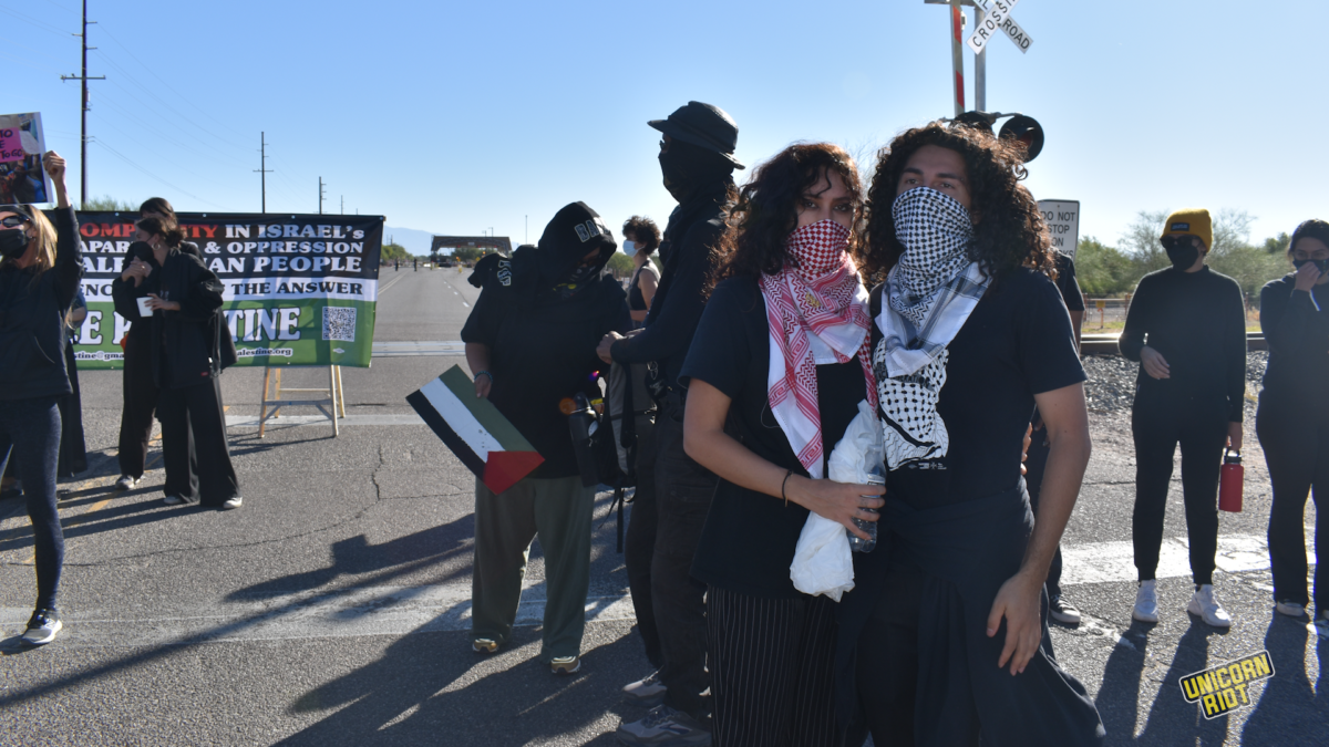 “We’re here specifically in front of Raytheon today because we understand that Raytheon supplies a majority, or a good chunk of the missiles, bombs and weapons systems that are currently enacting extreme violence on Gazans in Palestine,” said a representative of the Tucson Coalition for Palestine, who asked to be identified as Alex.
