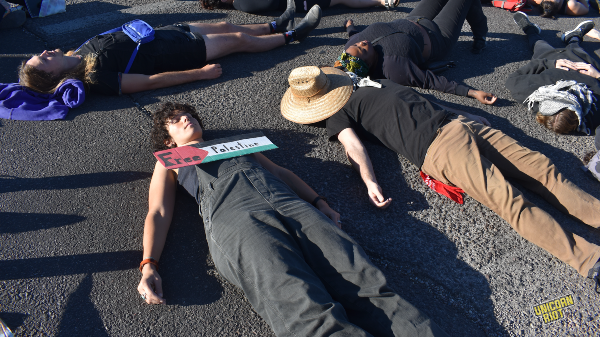“I’m here because three of my four grandparents survived the holocaust,” said Ana Alderstein, who participated in the die-in with a small, handmade sign featuring a Palestinian flag over their chest. “To continue to perpetuate this cycle of abuse and another genocide is not going to bring healing for anyone’s people.”