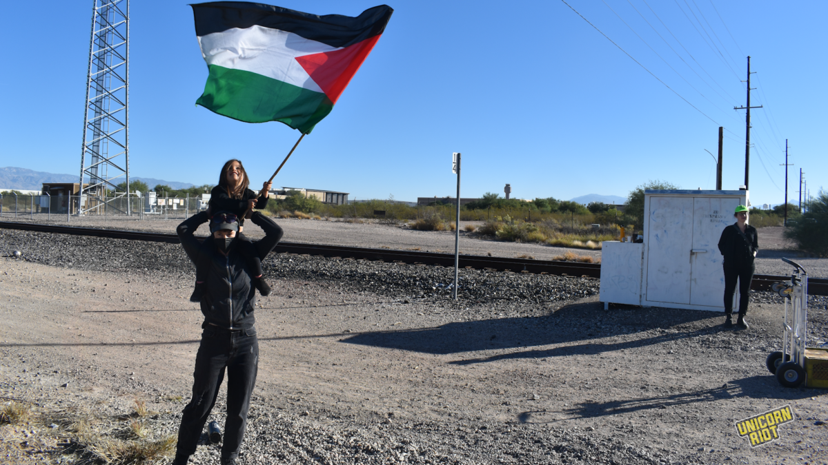 A child waves a Palestinian flag in front of the entrance to Raytheon’s compound on the southside of Tucson. Photo contributed by Ryan Fatica.