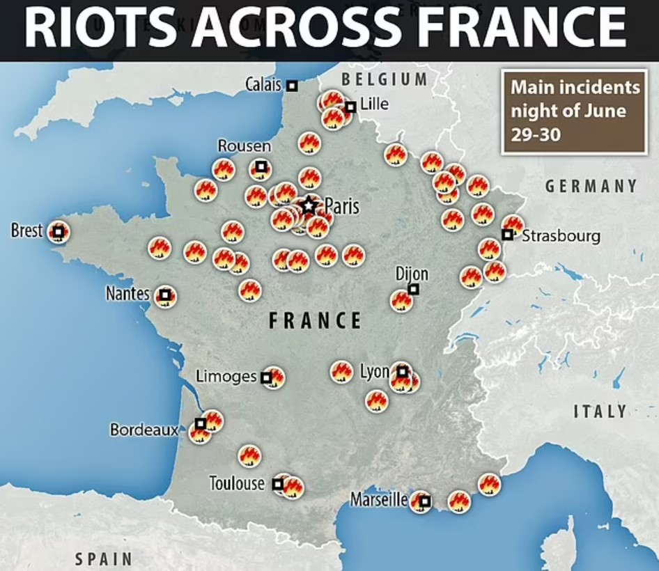 Starting from the Paris metropolitan area and spreading throughout the whole country, a massive revolt took place in response to the killing. Police stations, schools and other public buildings were attacked, fires were set and extensive looting took place. The main phase of the revolt took place from June 27 – July 2.