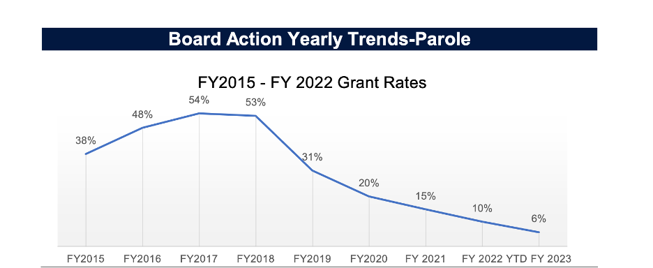 The rate of parole in Alabama is now about 6%, an historic low, with just 116 individuals granted parole in the first three months of 2023 out of a total of 2,040 who were eligible.