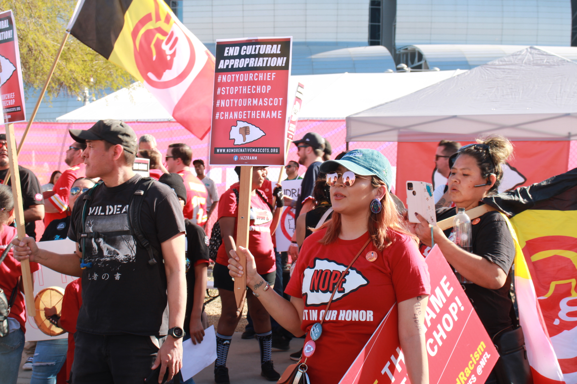 Protestors outside Super Bowl LVII demonstrated that Kansas City drop its team name “Chiefs” on Sunday, February 12, 2023. Photo taken by Darren Thompson.