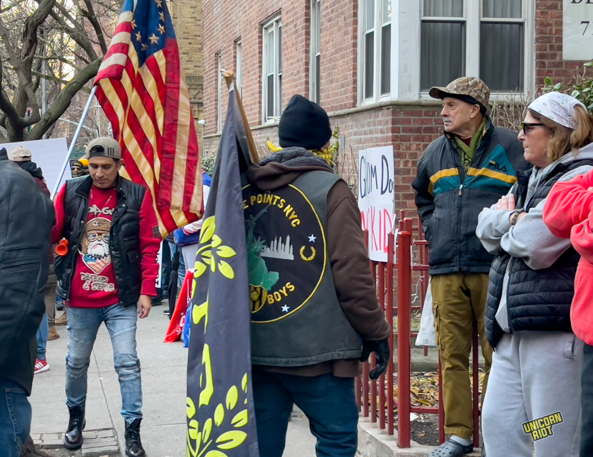 Edwin de la Cruz, a Republican who ran for New York State Assembly District 72 in 2022, was seen speaking to Proud Boys during the event. Shawn Olivo, Pedro Gutierrez, David Rem, Bob Porco, and Augusto “Lito” Alarcon are frequent attendees of similar protests, and were seen at this event yelling at the community defenders and threatening to assault them. A January 6 insurrection participant, Danny Christmann, was also present.