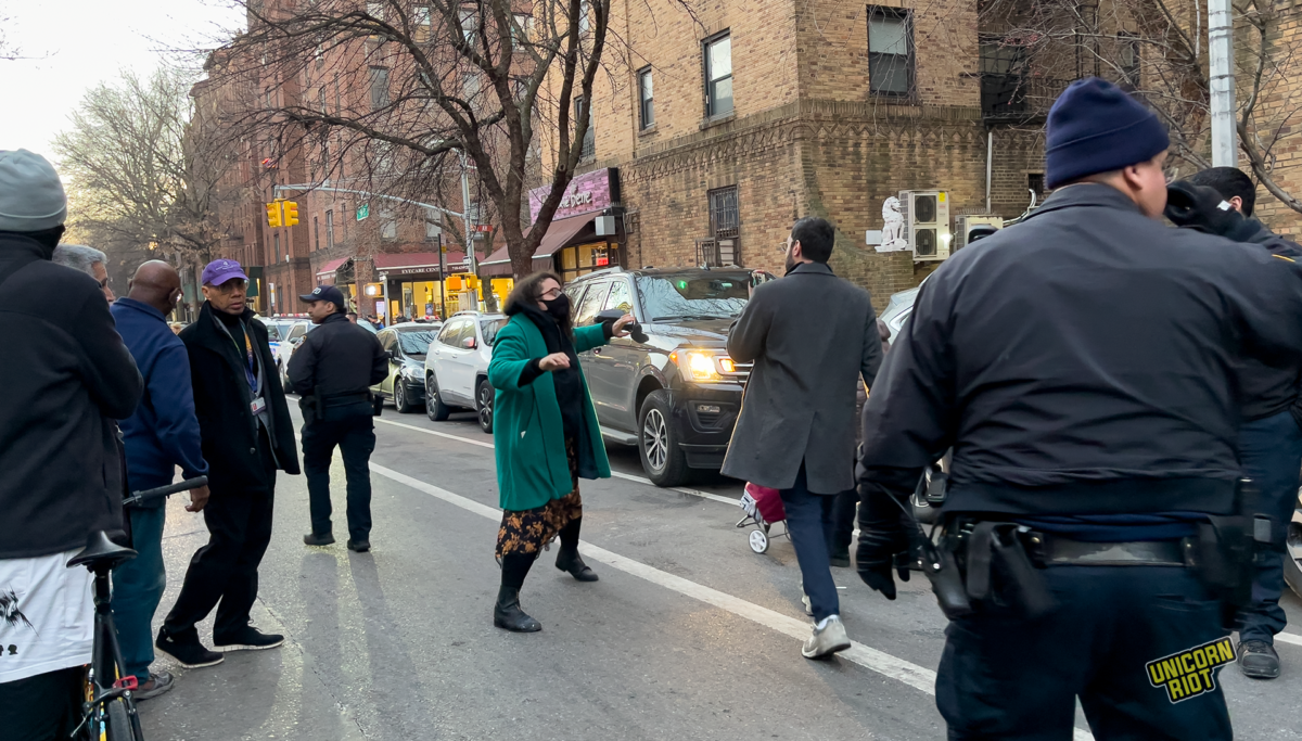 NYPD officers began forcing community defenders onto the sidewalk across the street and blocking press from getting close to the protesters, forming a barrier between protesters and everyone else as the group of protestors attempted to regroup. As Unicorn Riot got close to the huddle of protesters, NYPD officers approached the few members of the press still on the same corner as the protesters. “I’m just going to step in between you guys, just letting you know. If I put my hand on you, it’s guiding you,” said Community Affairs Sergeant Salvia (#2437 Patrol Borough Queens North).