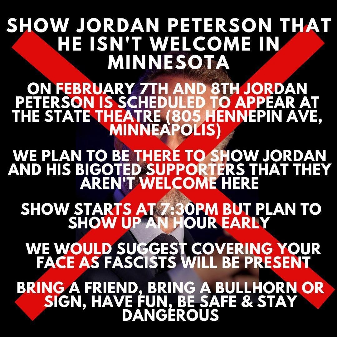 The push against Peterson’s visit to Minneapolis has been a multi-layered approach. Back in September 2022, a broad coalition of community groups along with liberal non-profits wrote to the Hennepin Theatre Trust (HTT), who runs the State Theatre where Peterson is booked, to “strongly urge the cancellation” of Peterson’s Minneapolis events. Some have been calling, others emailing, and others taking to social media for twitter storms and coordinated pushes for the event to be dropped from the venue.