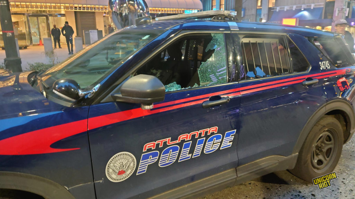 Unicorn Riot was on the ground covering events in several cities. In Georgia this evening as the sun set, one Atlanta Police vehicle got its driver’s side window smashed and another one was set on fire. In Minneapolis, MN, some graffiti targeted corporations tied to financing the “Cop City” project. In West Philadelphia, PA, a vigil was held at a turtle sculpture in Clark Park.