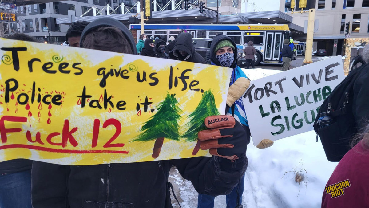 Two of the signs in the protest read, “Our revenge will be a world with no police and no prisons” and “Trees gives us life, police take it.”