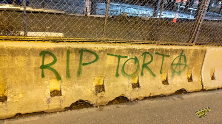 A small breakaway march from the vigil at Clark Park looped through the streets and someone tagged “RIP TORT” on a Jersey barrier.