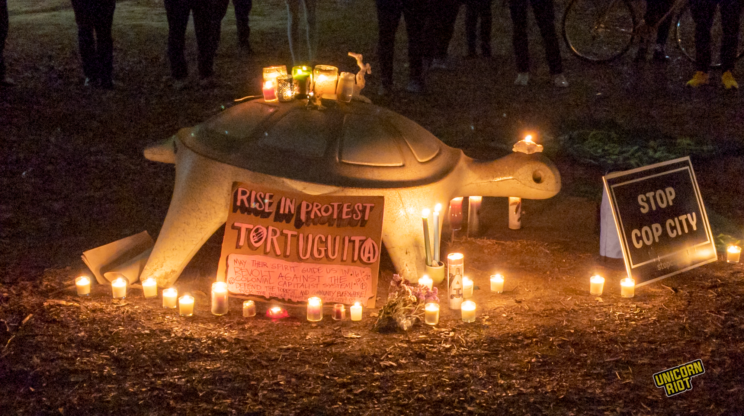 In West Philadelphia, community members held a candle-lit vigil at a turtle sculpture in Clark Park to remember Tortuguita. About 70 people joined the vigil and talked about local struggles. One shared a memory of meeting Tort in the forest last year.
