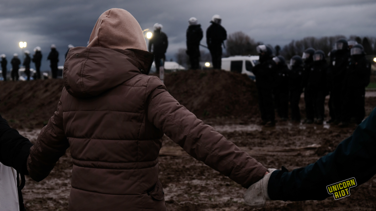 After evading the hundreds of riot police swinging batons, charging on horses, and commanding barking dogs, the activists were eventually encircled near the mine’s edge. Police surrounded the group for over two hours while they decided how to process them and waited for police vans to arrive. The activists were eventually brought by force to an ID check and released later that evening.