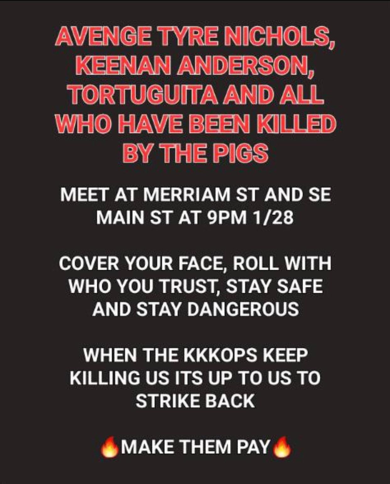 Because the public callout flyer for the Minneapolis protest hasn’t been sourced to any particular group, movement, or person, Unicorn Riot spoke with several local activists about the protest both before and after. Some expressed worry that the protest may have been part of a government operation to either entrap people or just add to their surveillance database and others expressed anger at Tyre Nichols’ death and said any call for a protest is legitimate, even if it’s militant and anonymous – many local demos have been organized anonymously, either on social media or not.