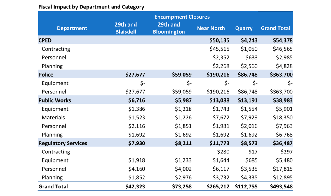 A report (pdf) from the City of Minneapolis titled A City Response to Homelessness revealed data from a “Fiscal analysis detailing encampment closure costs”:
