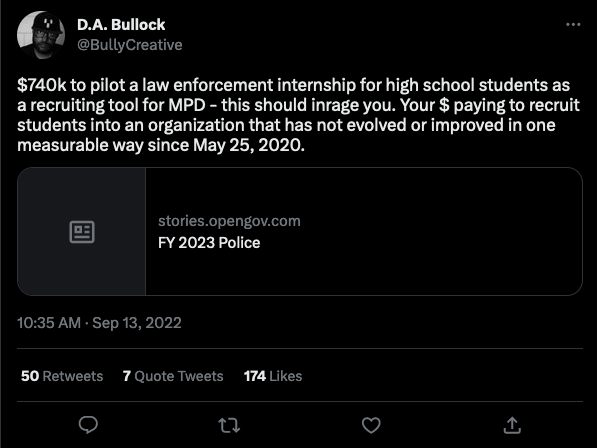 North Minneapolis filmmaker and abolitionist D.A. Bullock tweeted his outrage about the program, claiming that nothing has changed with the department since Floyd’s murder.