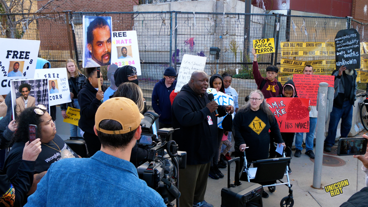 The demonstration this year saw a lower turnout as it fell on the same day as a Palestine solidarity protest four miles away that was attacked by a car just hours earlier. Regardless, the gathering at the precinct provided an important space for families to speak, be heard, grieve together, and gather in community with activists. The protest was co-organized and hosted by Michelle Gross of Communities United Against Police Brutality (CUAPB), who has helped organize each year since the national day of protest started 1995.