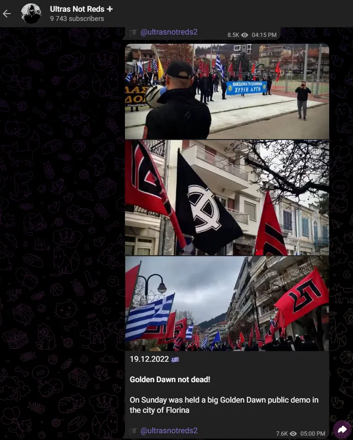 Golden Dawn’s gathering was also promoted by international radical right channels on Telegram, with one of them stating: “Golden Dawn is not dead,” while the nationalist channel “Hellas Youth” reported that, “A new Macedonian Struggle is rising with the movement of Greek Nationalists, with GD being once again in the vanguard.”