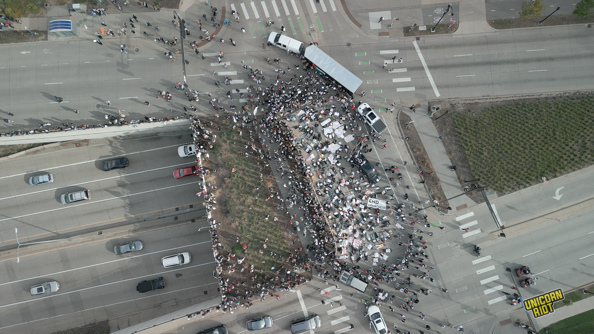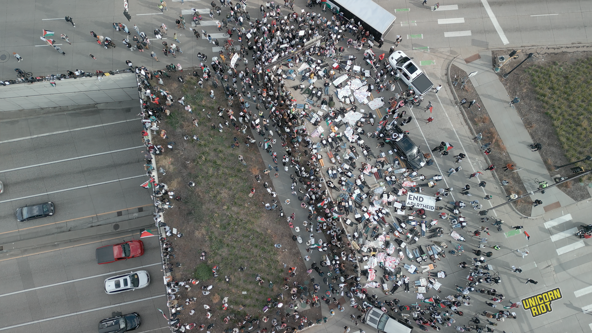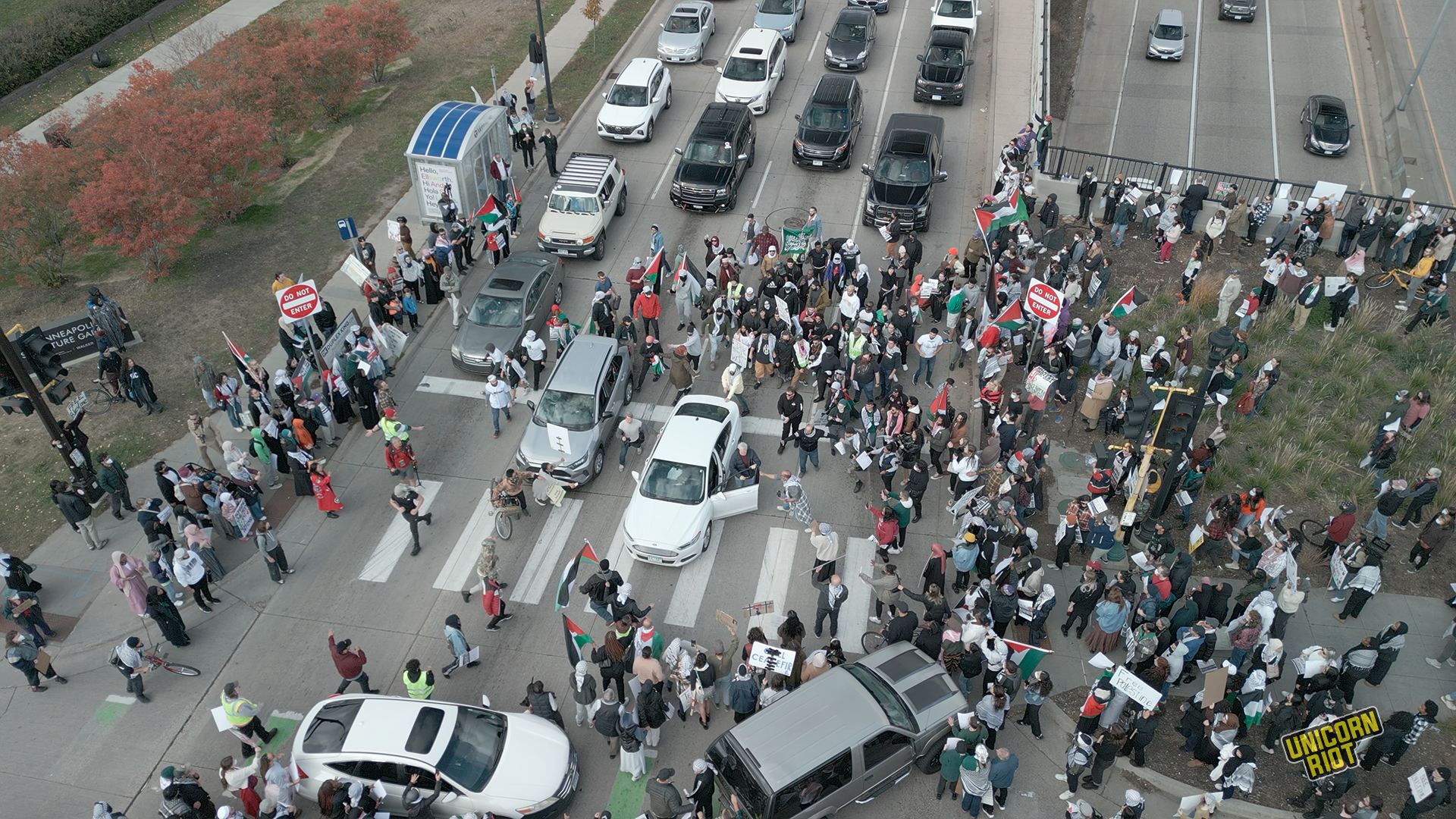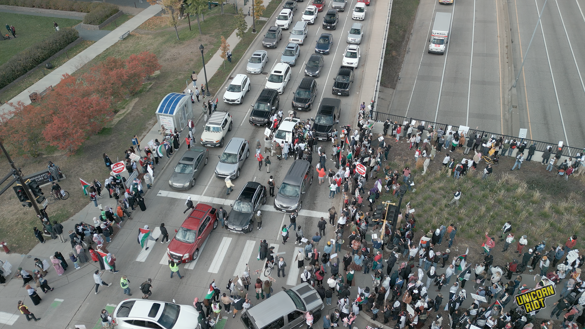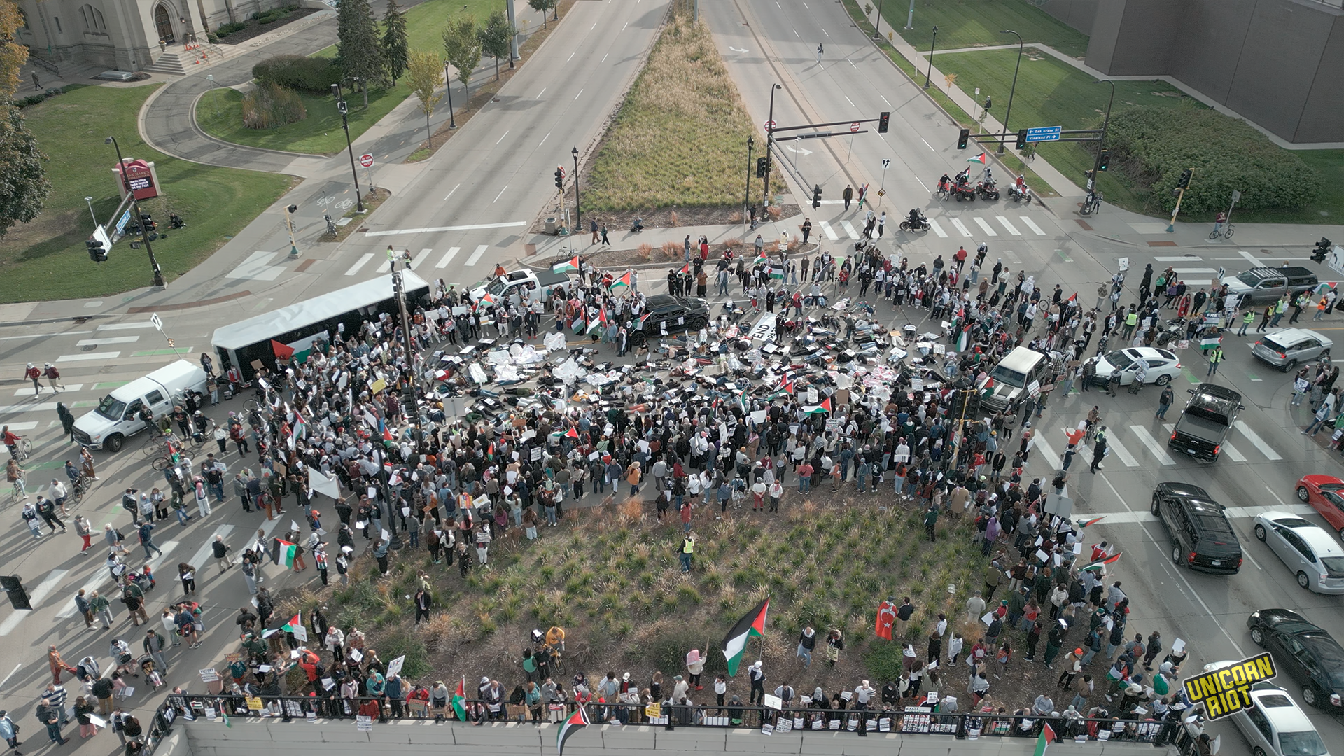 Minneapolis, MN β An older white man drove his vehicle through pro-Palestinian protesters and brandished both a box cutter and a knife on Sunday afternoon. The attack is part of a rising trend of violence on protesters and came as thousands of people held a busy Minneapolis intersection performing a “die-in” for the thousands of Palestinians being killed in the deadly Israeli bombardment of Gaza that followed the Oct. 7 Hamas attack.