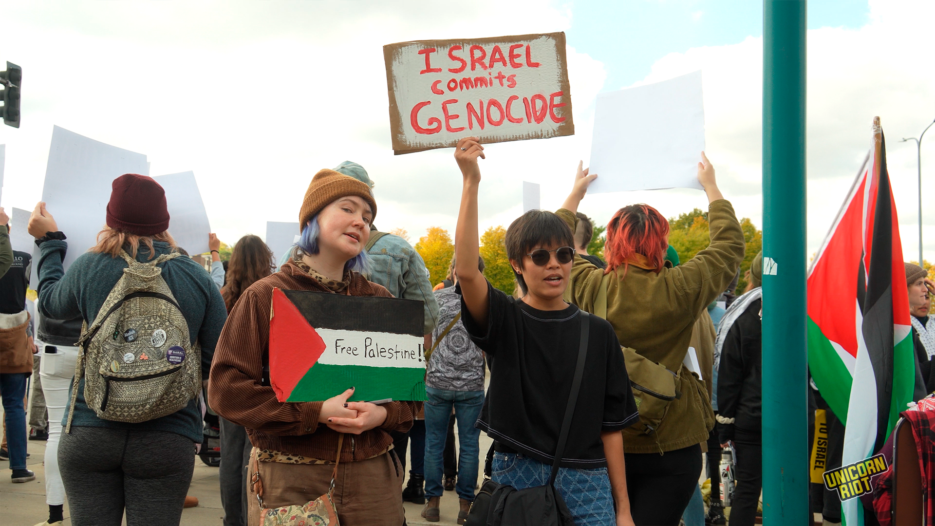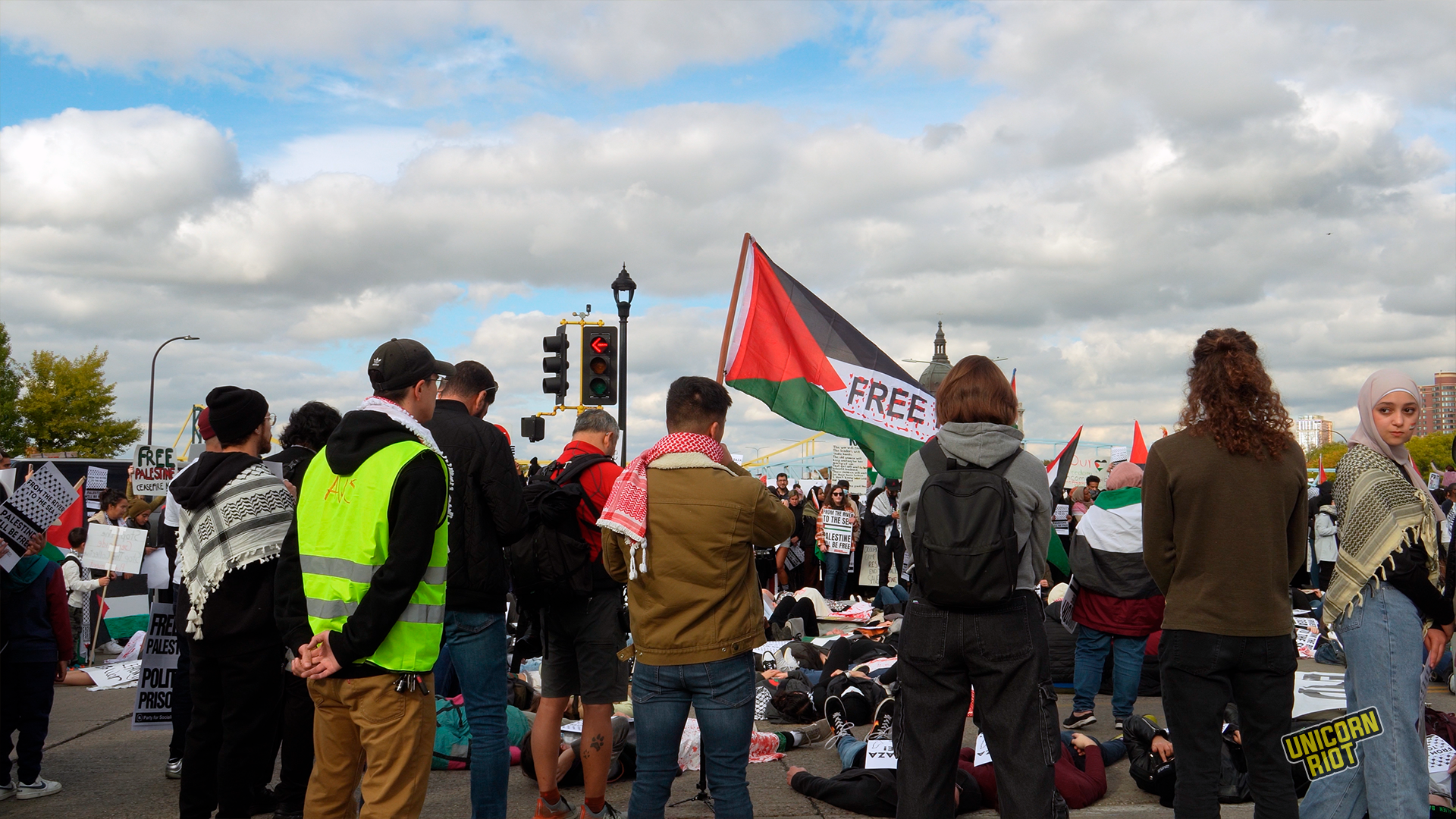 The protest on Oct. 22 was aimed at visibility with the chosen intersection between Loring Park and the Walker Art Center having a heavy amount of traffic. Protesters were holding signs and waving flags on the pedestrian bridge and off the sidewalks before taking the intersection for a die-in to commemorate the thousands of Palestinians dead. Chants heard included “Free Palestine,” and “Up with Palestine, down with occupation,” calling for an end to the Israeli occupation and “genocide” of the Palestinian people.