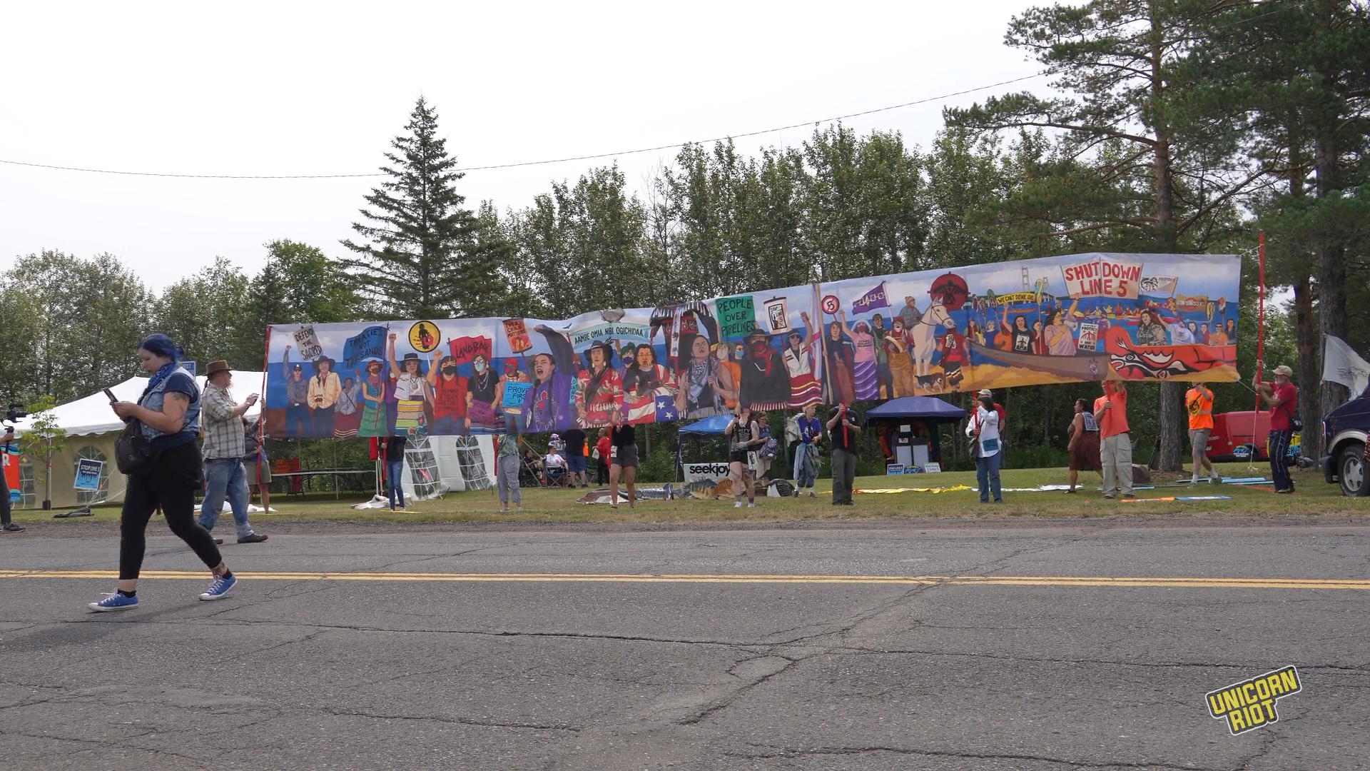 The same day as the judge’s trespassing ruling in June, local residents and supporters of the Bad River Band of Ojibwe called for an immediate emergency shutdown of Line 5. Banners and signs were installed along Lake Shore Drive in Ashland, Wisconsin, reading “Imminent Oil Disaster in Lake Superior #ShutDownLine5” and “We Stand in Solidarity With the Bad River Band | Shut Down Line 5.” Cars drove past the public displays, some honking in approval. An exhibit of a mural called “We Stand” was unveiled and brought on a brief march. For more from this action, watch our video below.