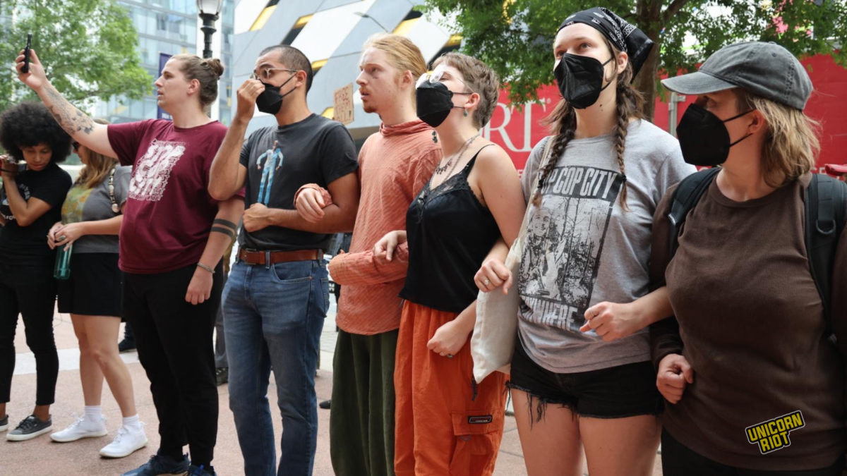 At least a dozen Atlanta Police officers were seen coordinating with the office building’s private security employees. Police responded by lining up outside the building’s entrance and facing the two dozen or so protesters assembled on the sidewalk. After about 45 minutes of making noise and taking up space outside the 1349 W Peachtree office building, the group marched around the area before dispersing.