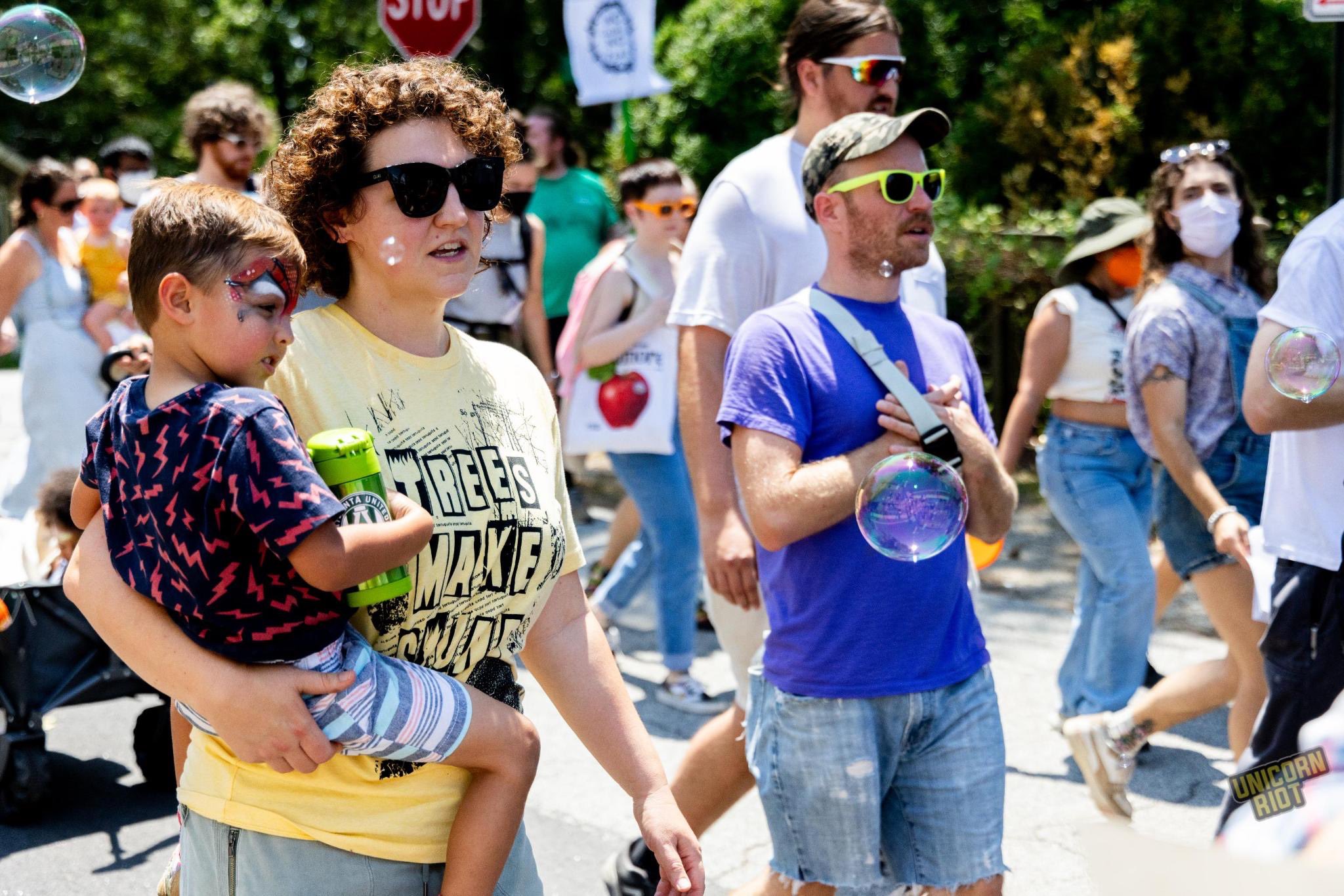 A white child with Spider-Man-style face paint over their eyes is held by their parent as they walk amidst the larger crowd of protesters.