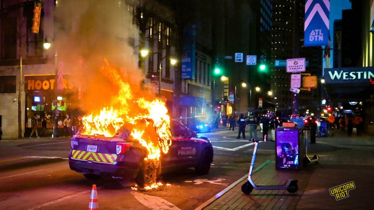 Three days later, a fiery protest took the streets of downtown Atlanta, as people smashed windows at the Atlanta Police Foundation headquarters, destroyed two police vehicles, and damaged storefronts of companies funding APF’s push to build ‘Cop City.’ The militant action sent a clear message: the police killing of Tortuguita would not stop the movement, and those responsible would continue to face consequences.