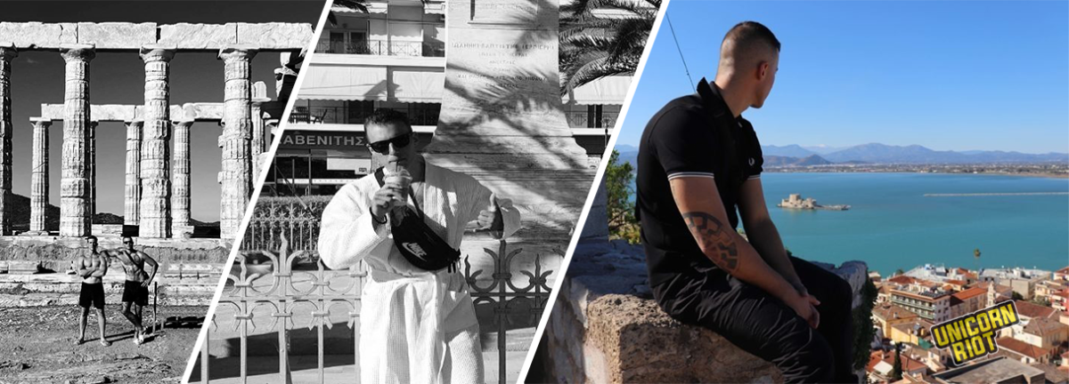 Colborne confirms this information, and according to his own research, Rundo was also found in Nea Kios, another village in the area. A comparison of a screenshot of a video uploaded to a far-right Telegram channel with this location in Nea Kios seems to confirm the presence of the American far-rightist there as well. The photos of him at the statue of Leonidas in Sparta, in some of which he even seems to be giving a Nazi salute, reveals the town of Sparta as another place he visited in Greece. In another video found on a Telegram channel associated with Rundo, he, alongside fellow white supremacist and RAM member, Grady Mayfield, are seen in Olympia, Peloponnese. However we cannot be certain of the date this video was taken.