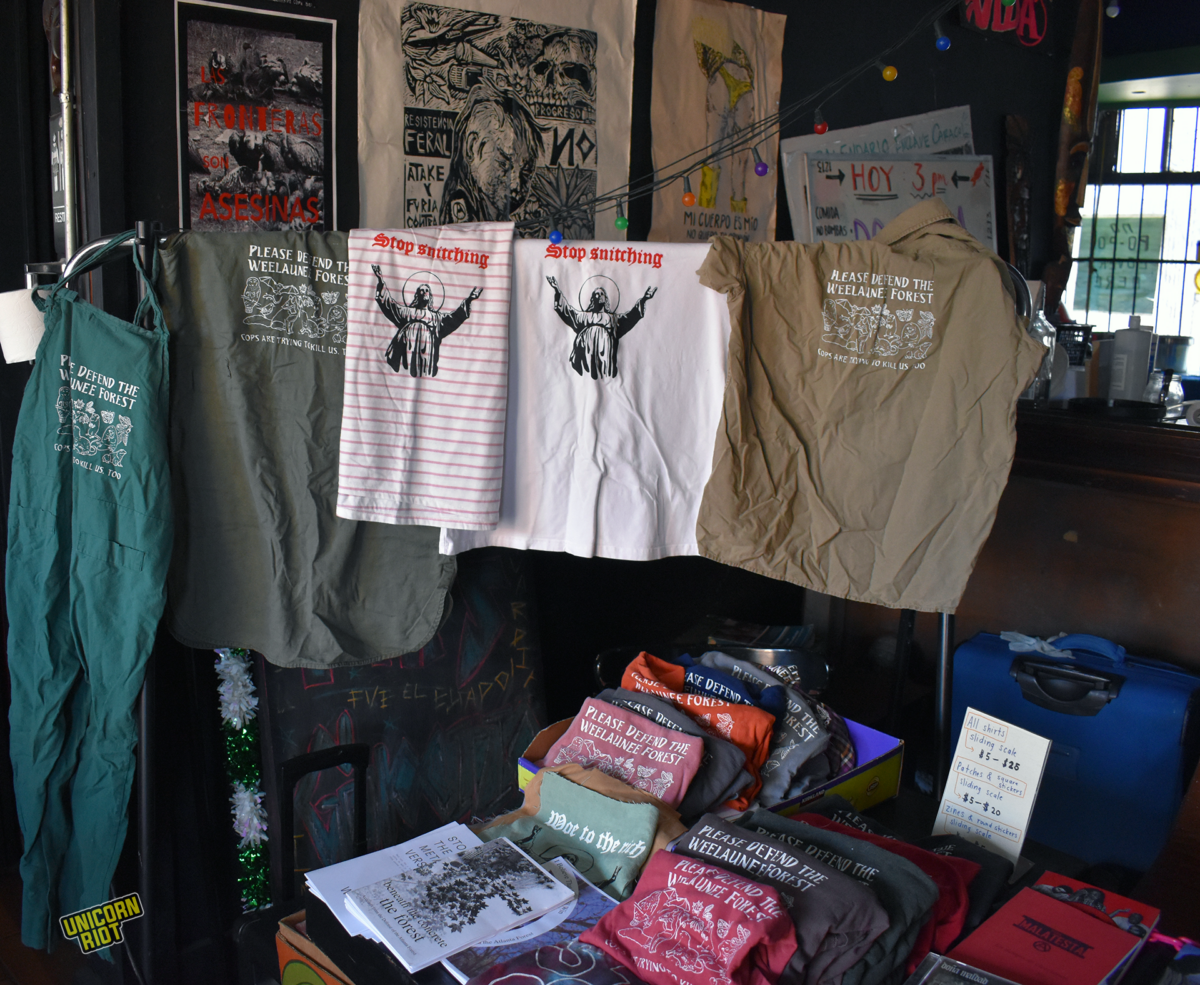 Artists and activists connected with the Stop Cop City Movement in U.S. brought t-shirts to the Tijuana gathering reading “Defend the Weelaunee Forest, cops are trying to kill us too!” with pictures of various forest animals. Photo contributed by Ryan Fatica.