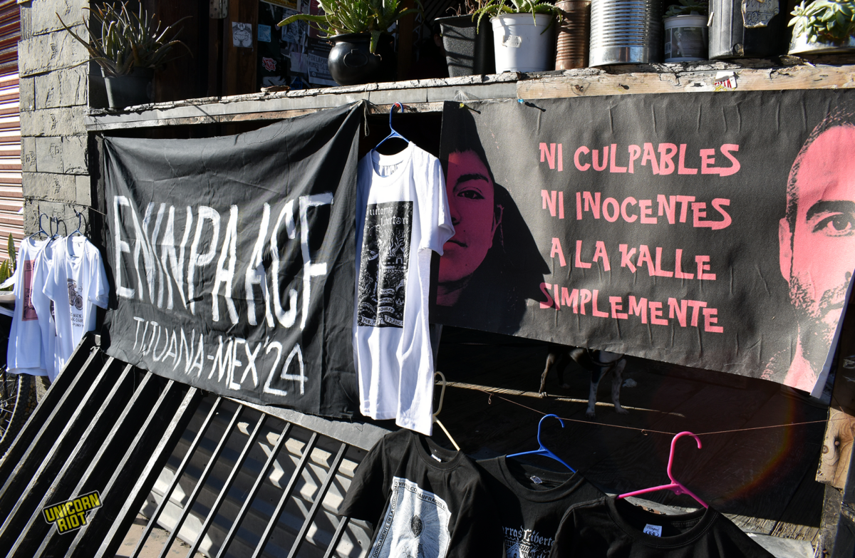 Banners hung on the exterior of Enclave Rabia Caracol, an anarchist community center in downtown Tijuana, during the International Gathering of Anarchist and Autonomous Practices Against Borders (ENINPAACF). The banner on the right, featuring the faces of Chilean anarchist political prisoners Mónica Caballero and Francisco Solar, reads, “Neither guilty, nor innocent, just let them out!” Photo contributed by Ryan Fatica.