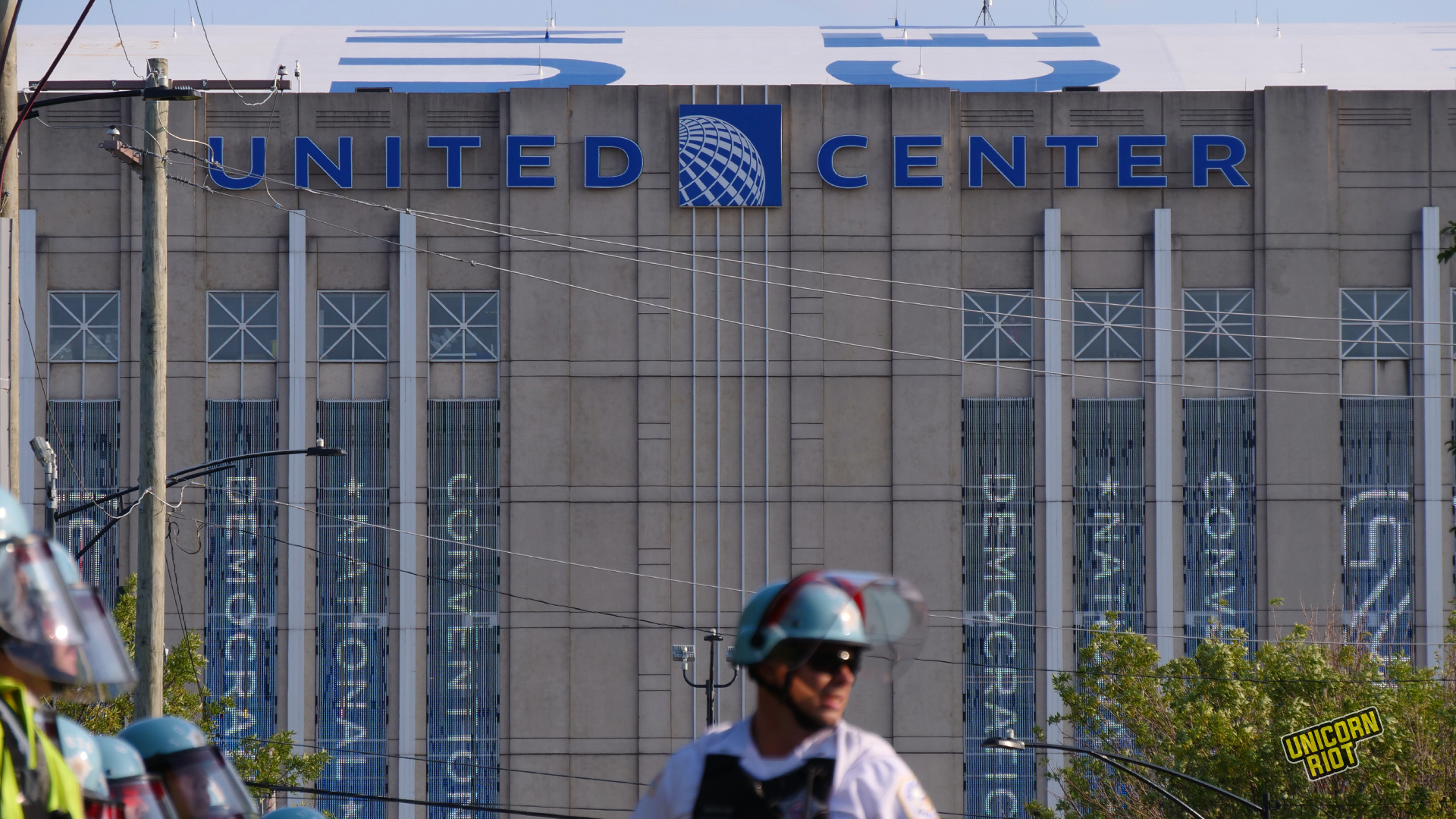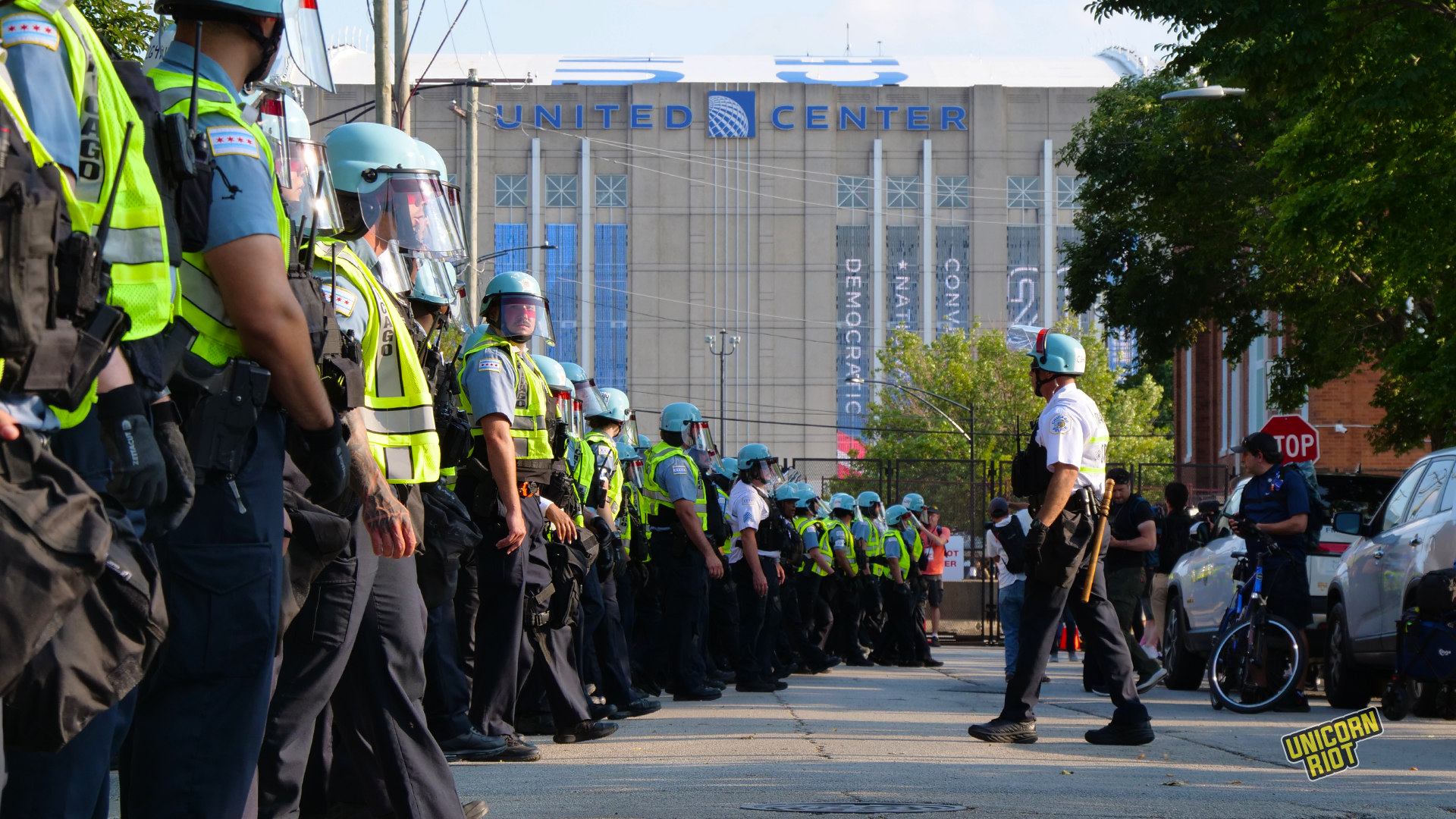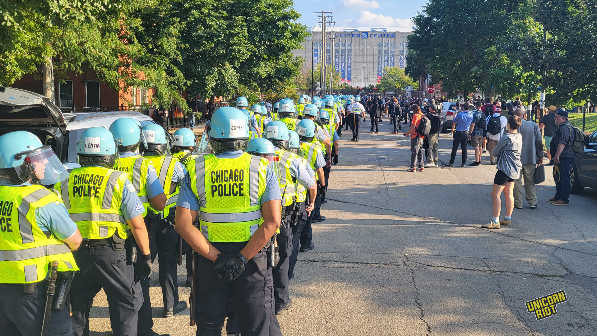 After staging the crowd and taking the street, the crowd of thousands of protesters approached the security perimeter of the United Center, where the first day of the Democratic Convention was getting underway. Some marshals affiliated with the March on the DNC 2024 Coalition attempted to prevent groups of fired-up protesters from directly approaching the DNC security gates; one more militant protester upset at being policed by protest marshals was seen spraying black spray paint onto the marshal’s vests.