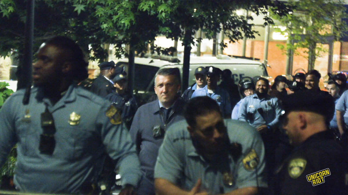 In a tense confrontation at the beginning of the stream, Philly officers in riot gear wearing “Counter-Terrorism Operations” badges briefly assembled inside the perimeter but withdrew.