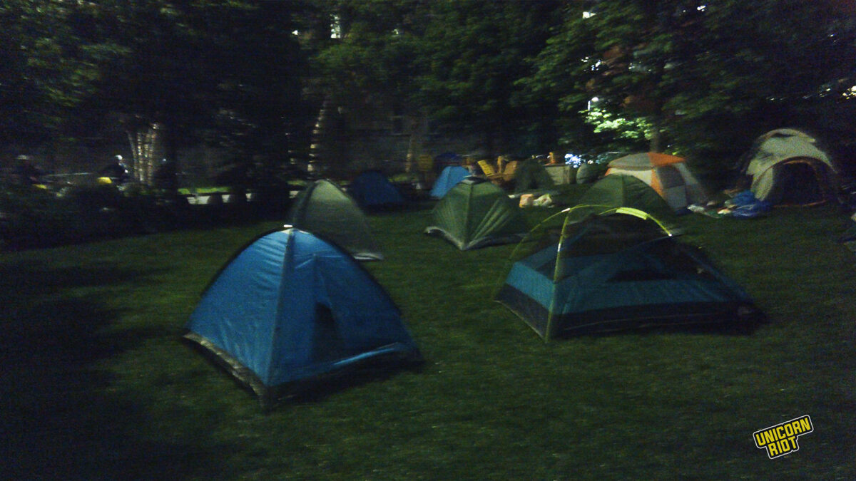 During late Saturday night, police were largely a static presence while dozens of students milled just outside the perimeter discussing politics and playing music. A lengthy know-your-rights training with Up Against the Law and National Lawyers Guild members also took place with most of the camp participants.