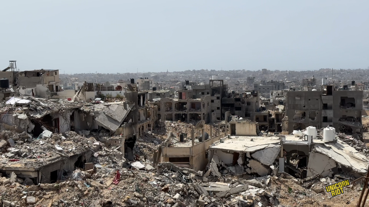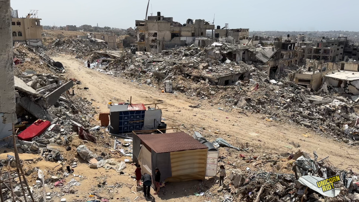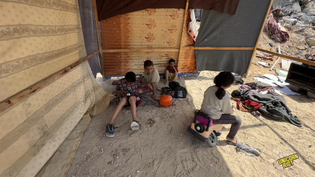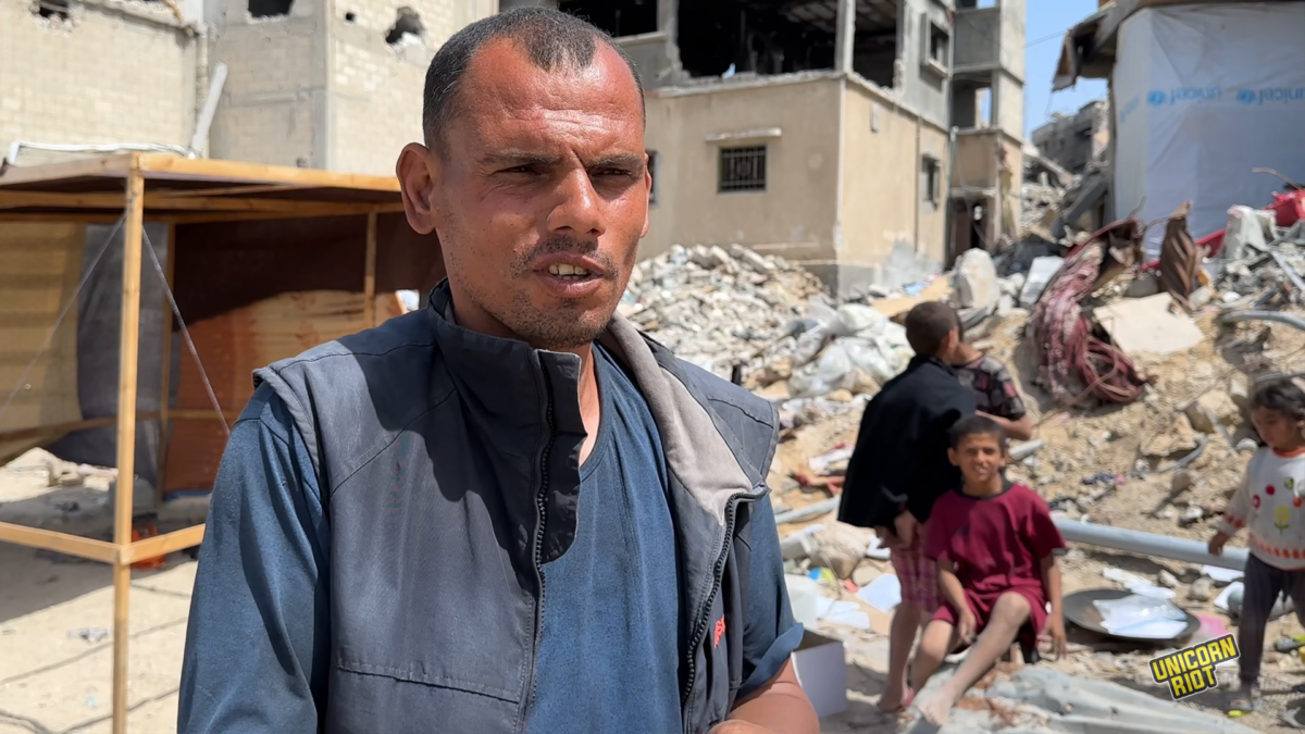 Unicorn Riot heard from Abu Daqqa while he was setting up the makeshift shelter for his family in front of where his home once was. “I journeyed from Rafah back to my home, now buried here, with no trace left behind. Some of it is buried beneath the ground, while the rest remains unknown,” said Abu Daqqa.