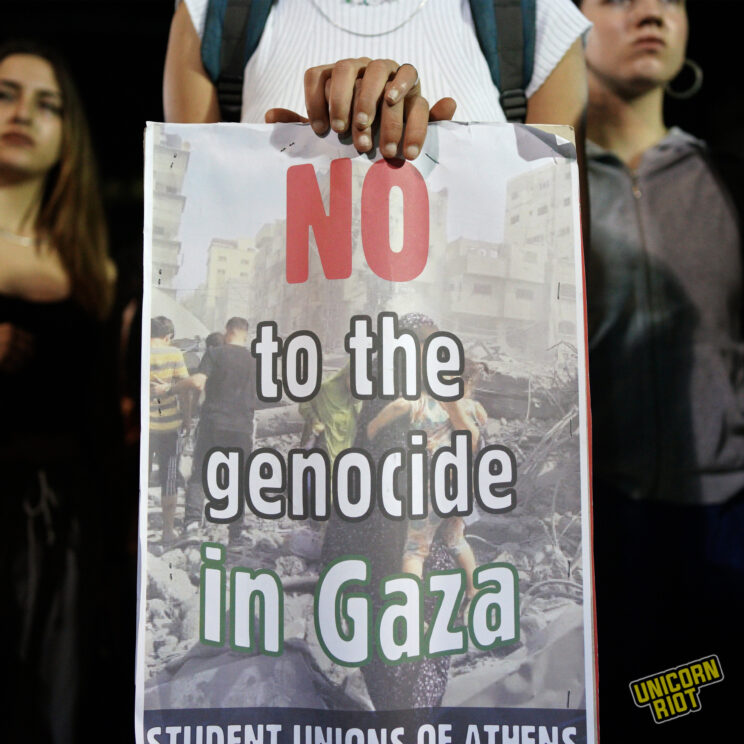 Back in Athens, Unicorn Riot heard from a student representative, Angelos Thomopoulos. “Today we become another link in the long chain of students worldwide who are demonstrating for Palestine. All the students in the world, from the USA and Greece, we are shouting with one voice ‘Freedom for Palestine’,” Mr. Thompopoulos told Unicorn Riot.