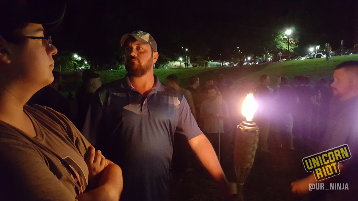 Blevins was photographed by Unicorn Riot amid tense moments at the infamous torch rally on the University of Virginia campus in Charlottesville, where students and demonstrators were attacked by a racist mob.