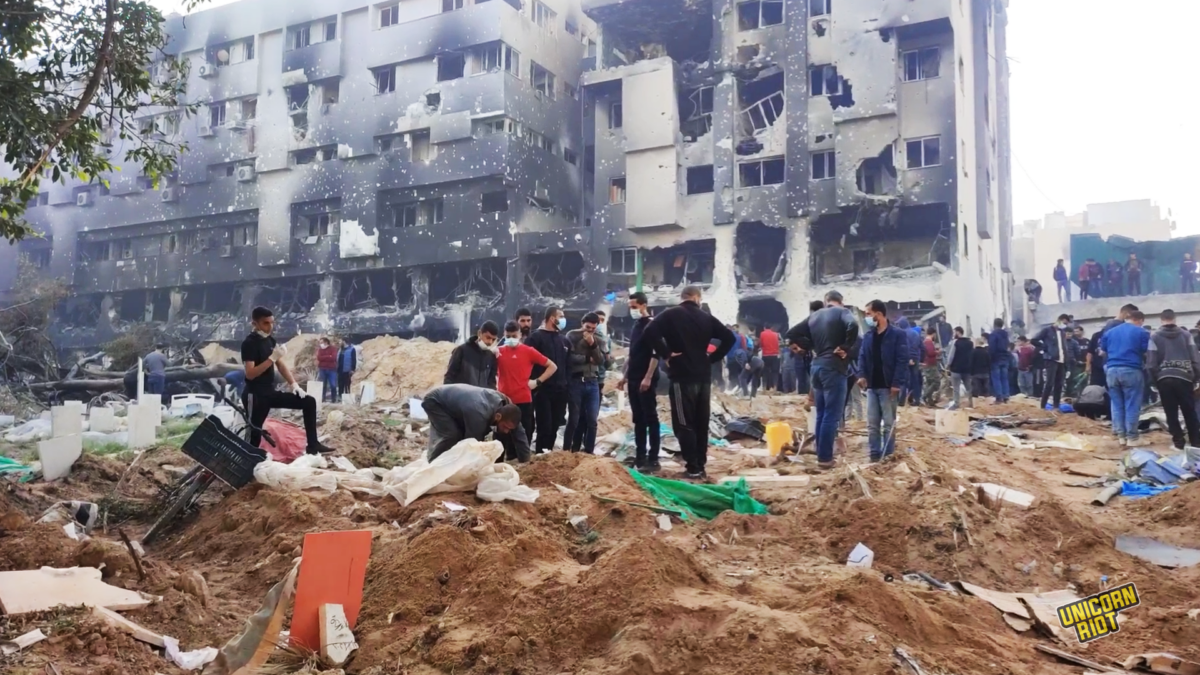 Palestinian Families Seek Bodies of Relatives After Israel Withdraws From Shifa Hospital Massacre from Unicorn Riot.