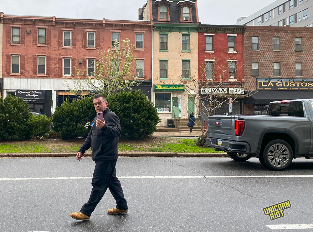 The late March protest was called by Extinction Rebellion Philadelphia and supported by Montgomery County-based Montco for Palestine. Protesters briefly held positions blocking the parking lot and main building entrances — in both cases they were threatened with arrest by Philadelphia Police Department Civil Affairs officers wearing plain clothes & body cameras, although no actual arrests or detentions took place. (The city government says that Civil Affairs is supposed to lead protest responses [PDF].) While one of the officers joked to an organizer that it was a small demonstration, the event highlighted that even early on a wet day people are committed to sending a message about the lethal products made by Day & Zimmermann.