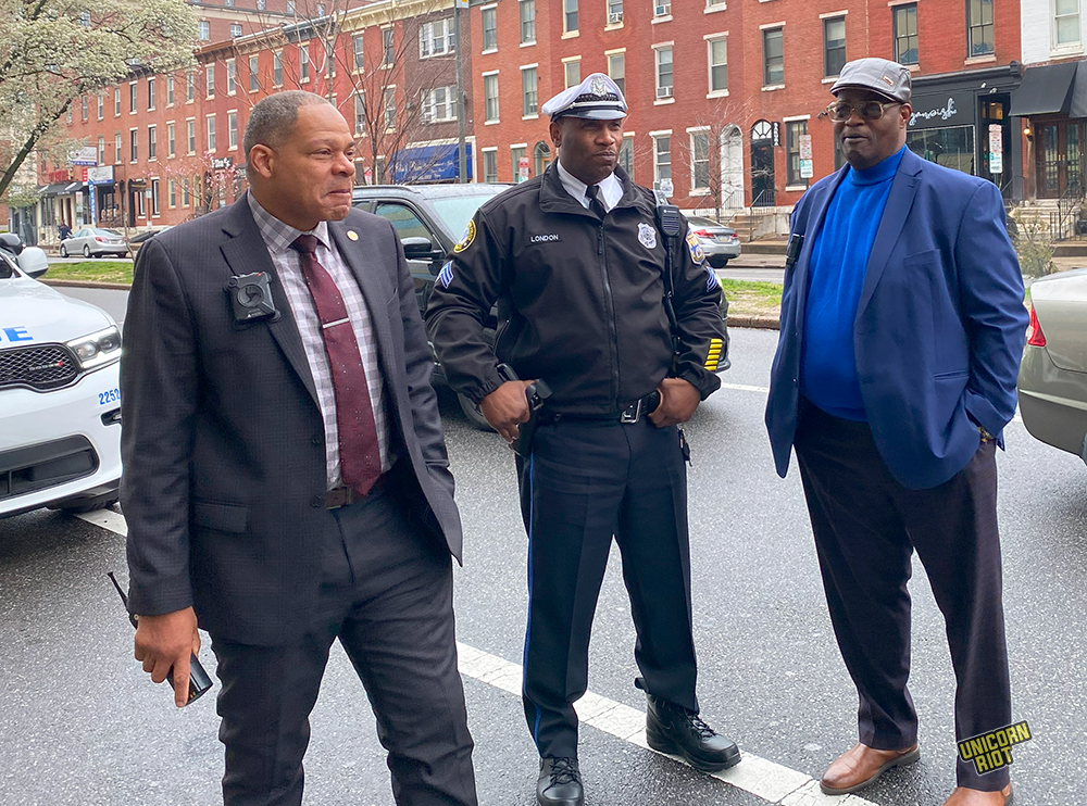 Image gallery: (1) Three observers from the building containing Day & Zimmerman offices; two recorded demonstrators. CBS-3 is co-located in the building and did not cover the demonstration. (2) An observer from inside the building recorded also demonstrators. (3) Three Philadelphia Police Department officers believed to all be from Civil Affairs. The officer at right issued threats to arrest after demonstrators blocked entryways.