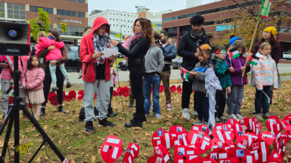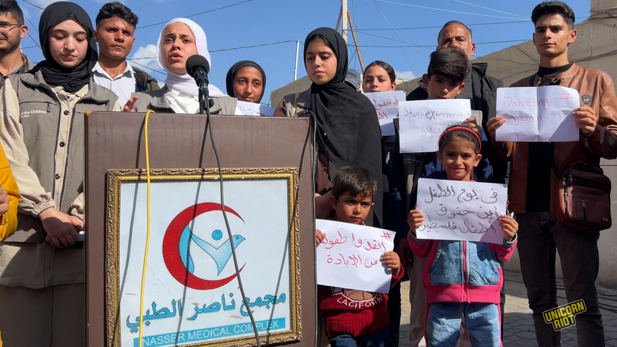 Khan Younis, Gaza, Palestine — With over 17,492 Palestinian children killed by Israel over the last year in Gaza, the Palestinian Children’s Council held a press conference in Khan Younis for World Children’s Day on November 20, 2024. Youth speakers in front of Nasser Hospital gave a rundown of Israeli atrocities during 411 days of genocidal war on the Gaza Strip.