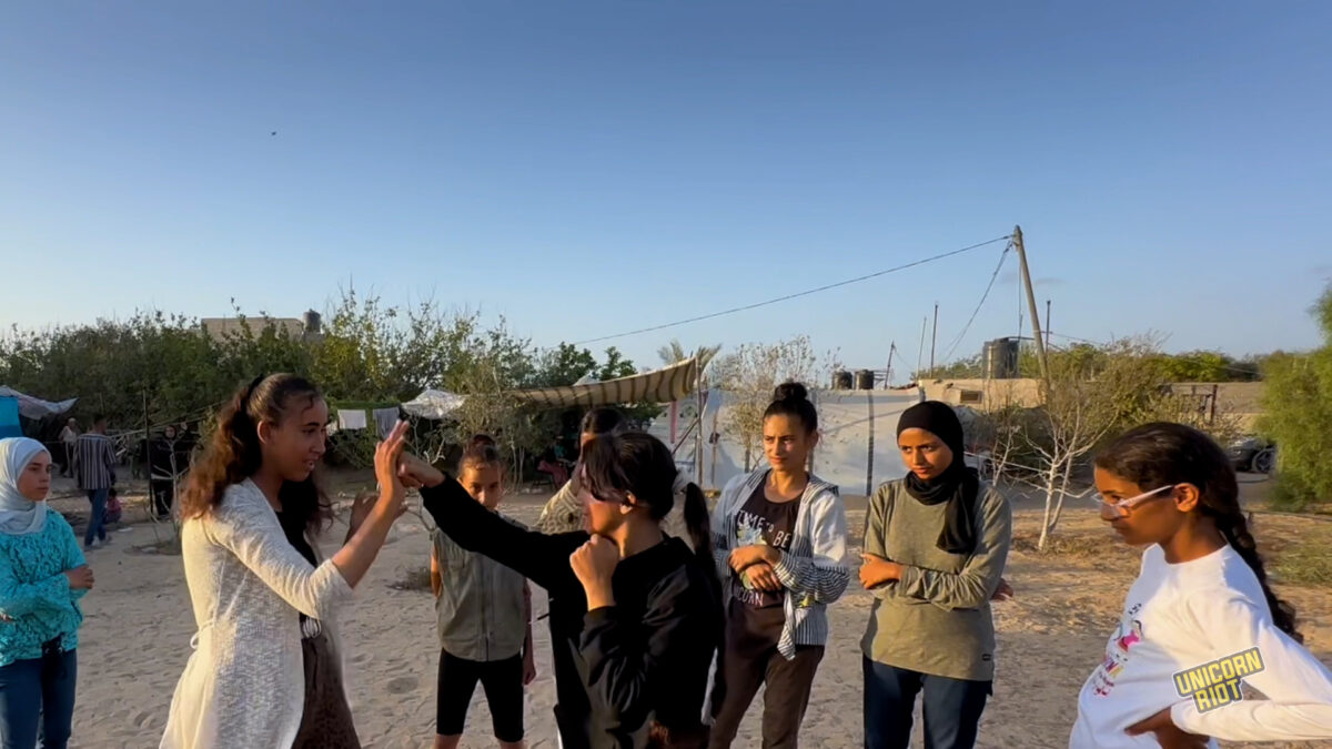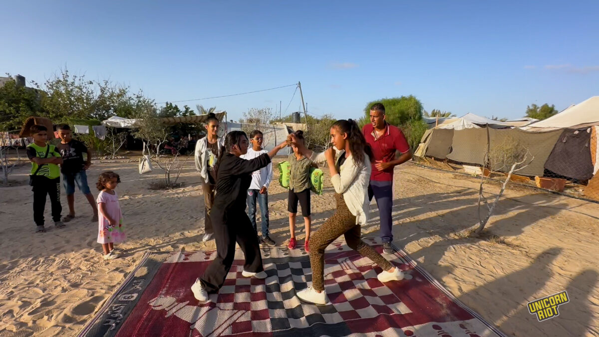 From the Abu Ghazi land camp in Khan Younis, Osama Ayoub and Naseem Ayoub spoke to Unicorn Riot about being displaced and continuing their boxing training with no equipment aside from a pillow and a rug to stand on.