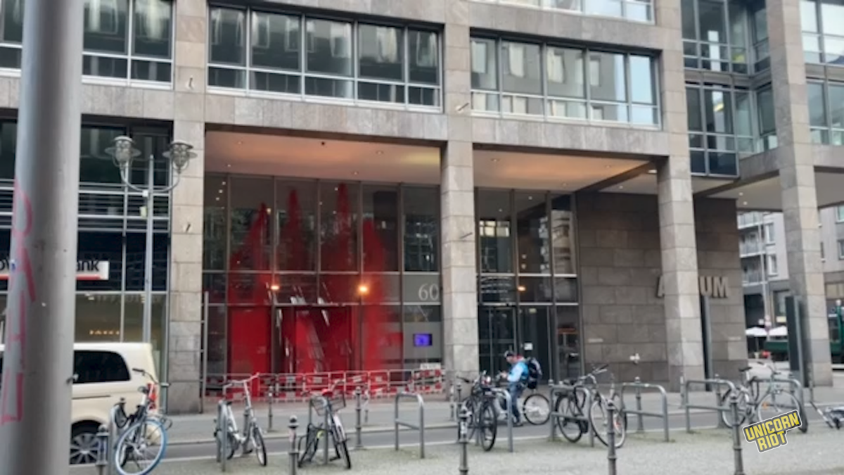 Berlin, Germany — In the middle of the night on Sunday, March 17, a group of anarchist Palestinian solidarity activists spray painted a building in downtown Berlin containing the offices of two entities currently contributing to the ongoing genocide in Gaza. The activists used a converted fire extinguisher to blast the building facade with red paint, and tag other parts of the building with pro-Palestine graffiti.