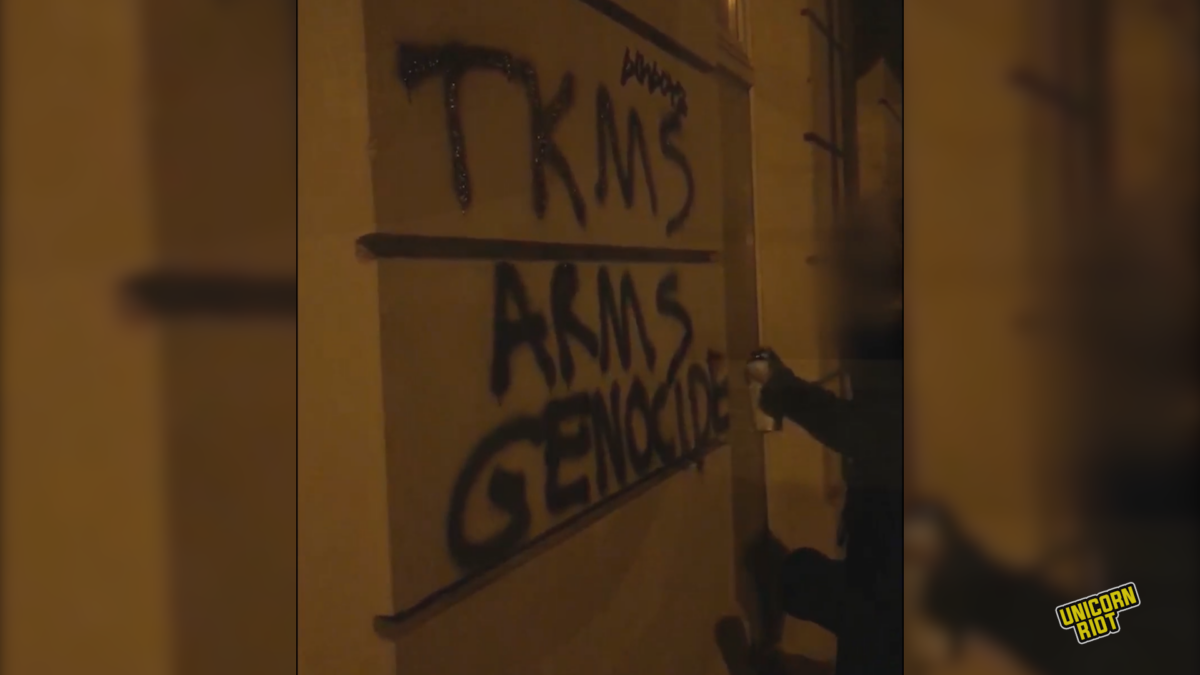Anonymous Participants: Germany is Israel’s second biggest arms supplier, supplying 28% of Israel’s weapons, including warships, aircraft, tanks, missiles, submarines, engines, and military vehicles. Weapons exports from Germany to Israel have increased tenfold since 2023, mostly since October. The German government subsidizes this as military aid and directly funds the weapons used to massacre the people of Gaza. For example, 1/3 of the price of the warships sold by our target ThyssenKrupp Marine Systems are subsidized by the German government. This is about more than trade. Germany is gifting weapons to Israel and actively participating in the genocide.