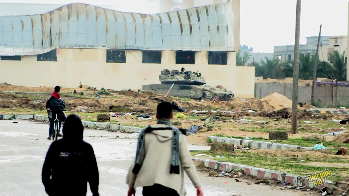 On January 29, Unicorn Riot heard from several civilians fleeing Khan Younis as Israeli tanks overlooked the population. At one point, the military can be heard shooting at the crowd.