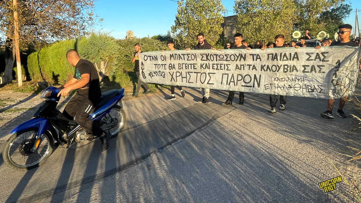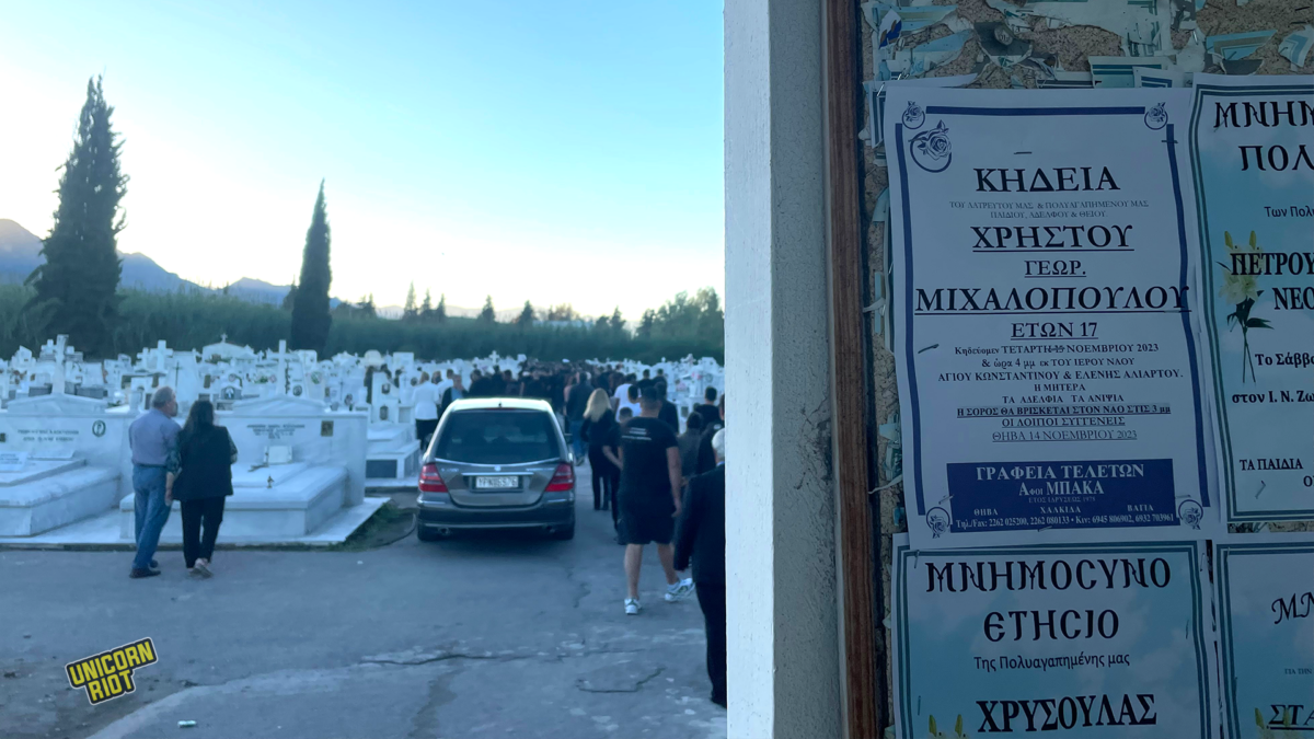 Cover image features friends and classmates of Christos Michalopoulos as they hold a gathering on Nov. 16, 2023, outside the Thiva courthouse, where the police officer who killed him give his testimony to the investigating judge. Graffiti on the street reads: “Christos, you’ll see, that you will be vindicated/justified.” Photo contributed by Yegor Halva.