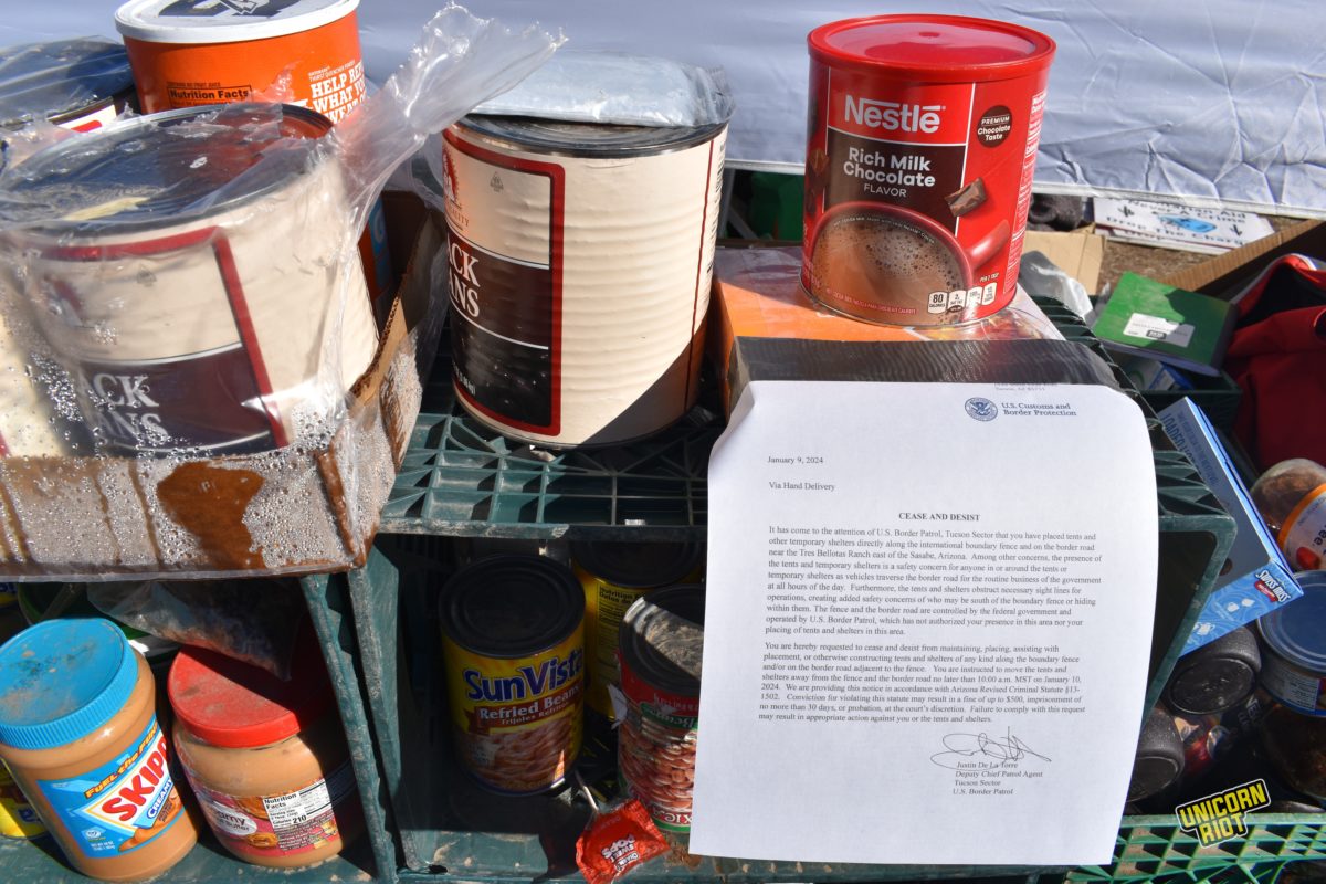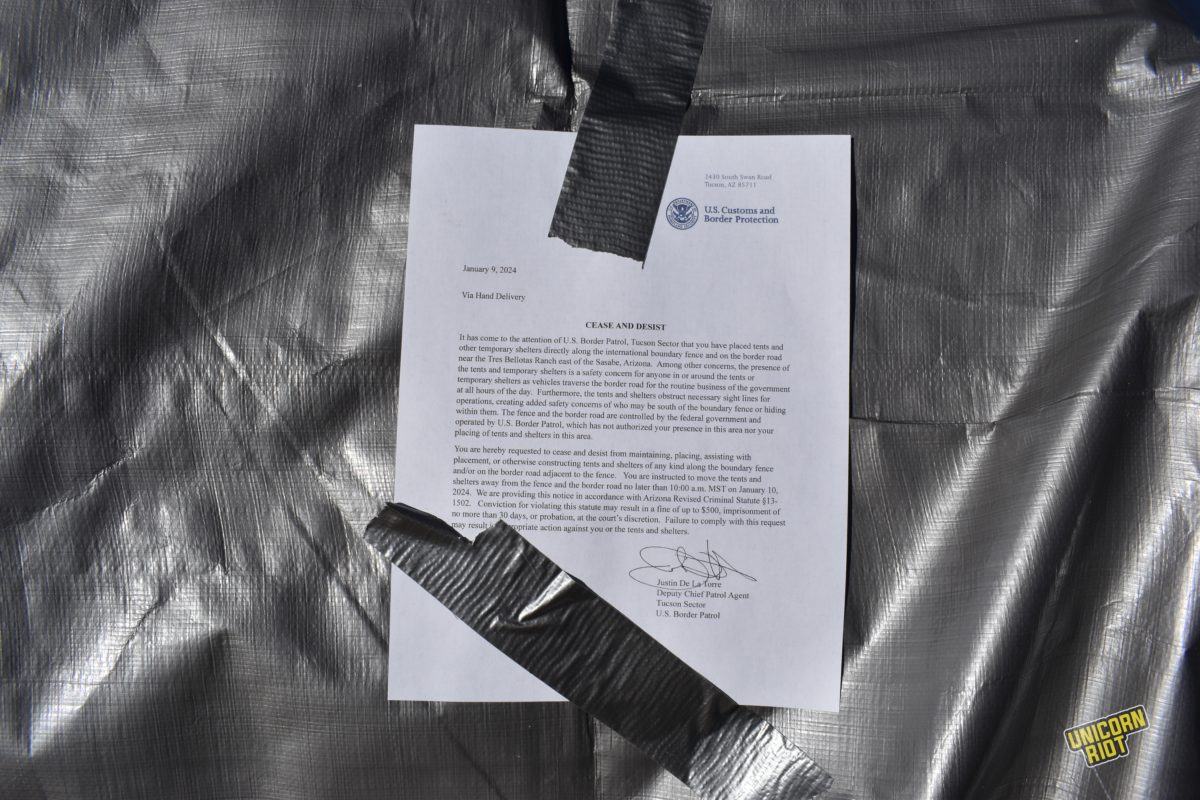 Rather than supporting the efforts of humanitarian aid workers trying to keep migrants alive, Border Patrol entered the aid camps Tuesday and taped ‘Cease and Desist’ notices on Customs and Border Protection (CBP) letterhead to structures, food supplies and water dispensers.