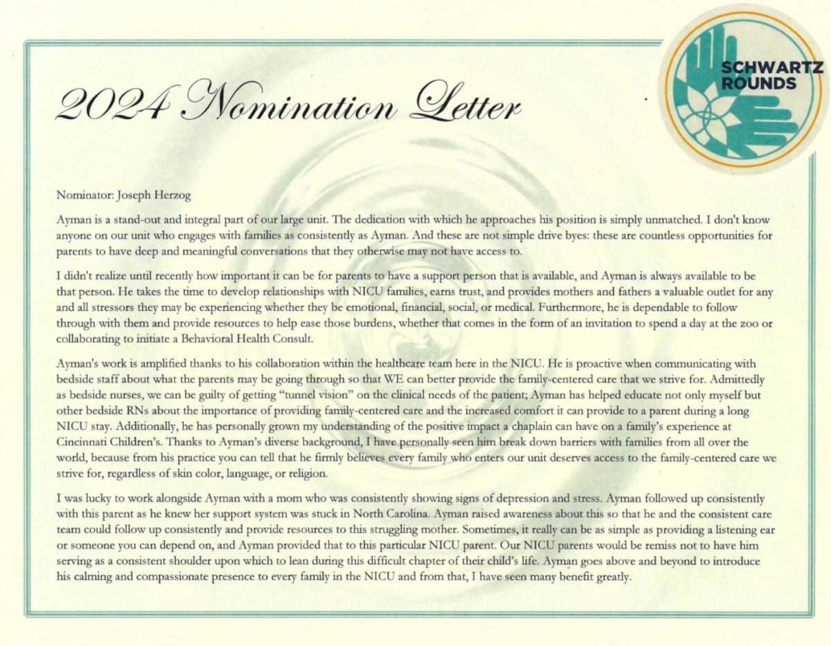 “Ayman is someone they have showered with awards and accolades for his care of the families and his relationship,” Ali said. “That’s evident also by the so many of the families coming forward and speaking to media about knowing him and what he did for them, as well as his colleagues,”