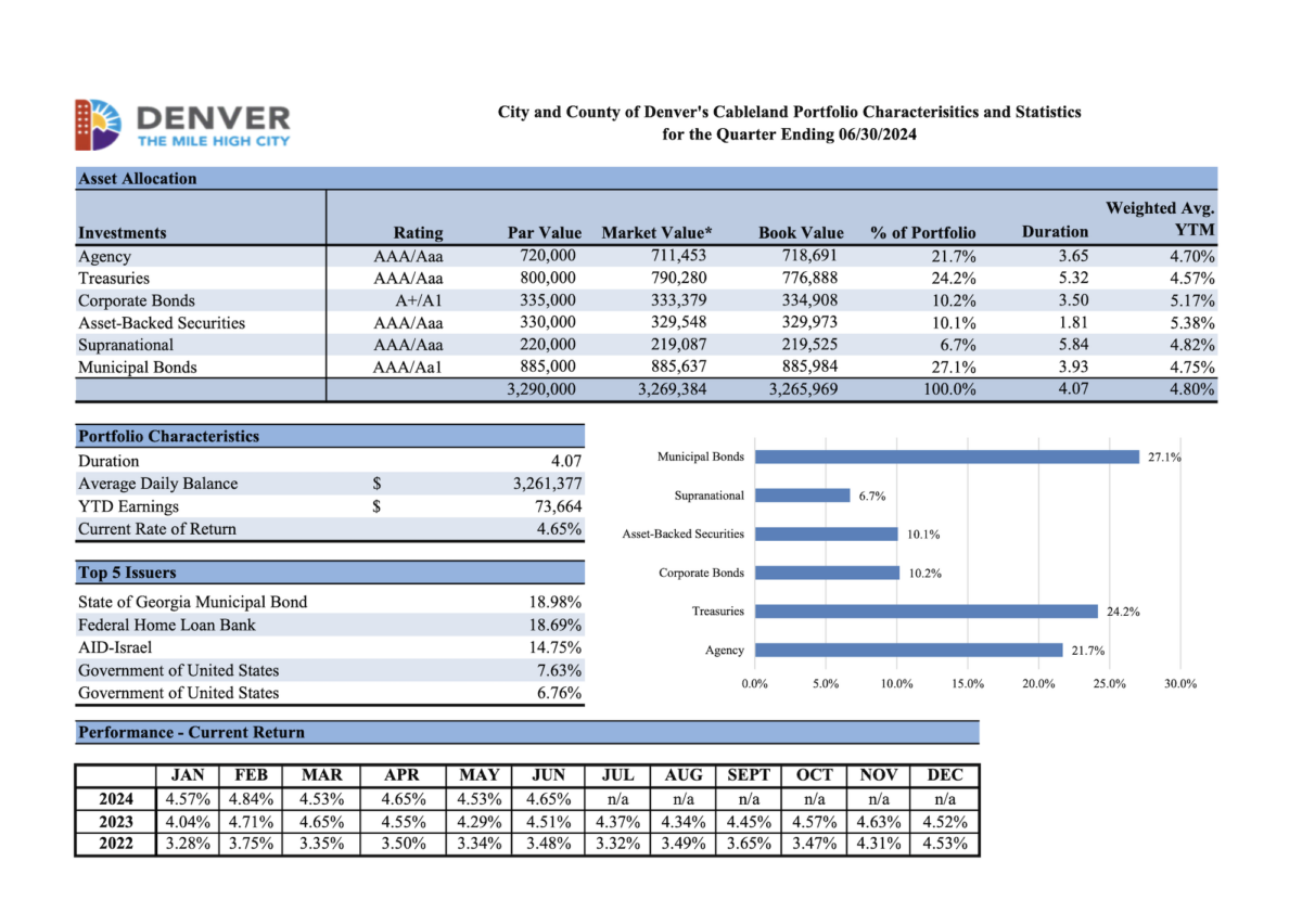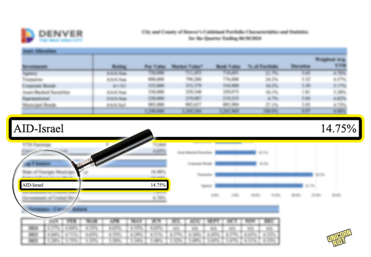 In addition to hosting the JNF conference in 2023, the city has concrete financial ties to Israel. In Denver’s Consolidated Portfolio Characteristics and Statistics report for the second financial quarter of 2024, AID-Israel was the 3rd top issuer of bonds for the city’s Cableland Portfolio.