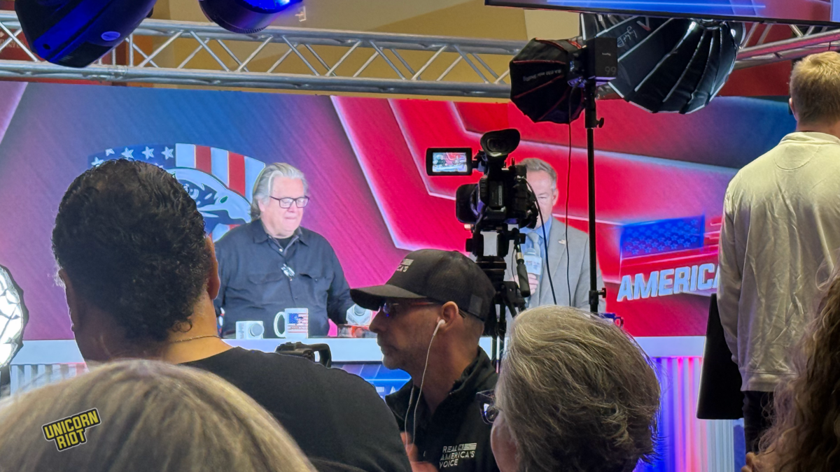 Beyond the Rumble studio was Steve Bannon’s War Room. On one occasion, Bannon himself was there, wearing at least three shirts and encouraging the crowd to invest in gold and silver.