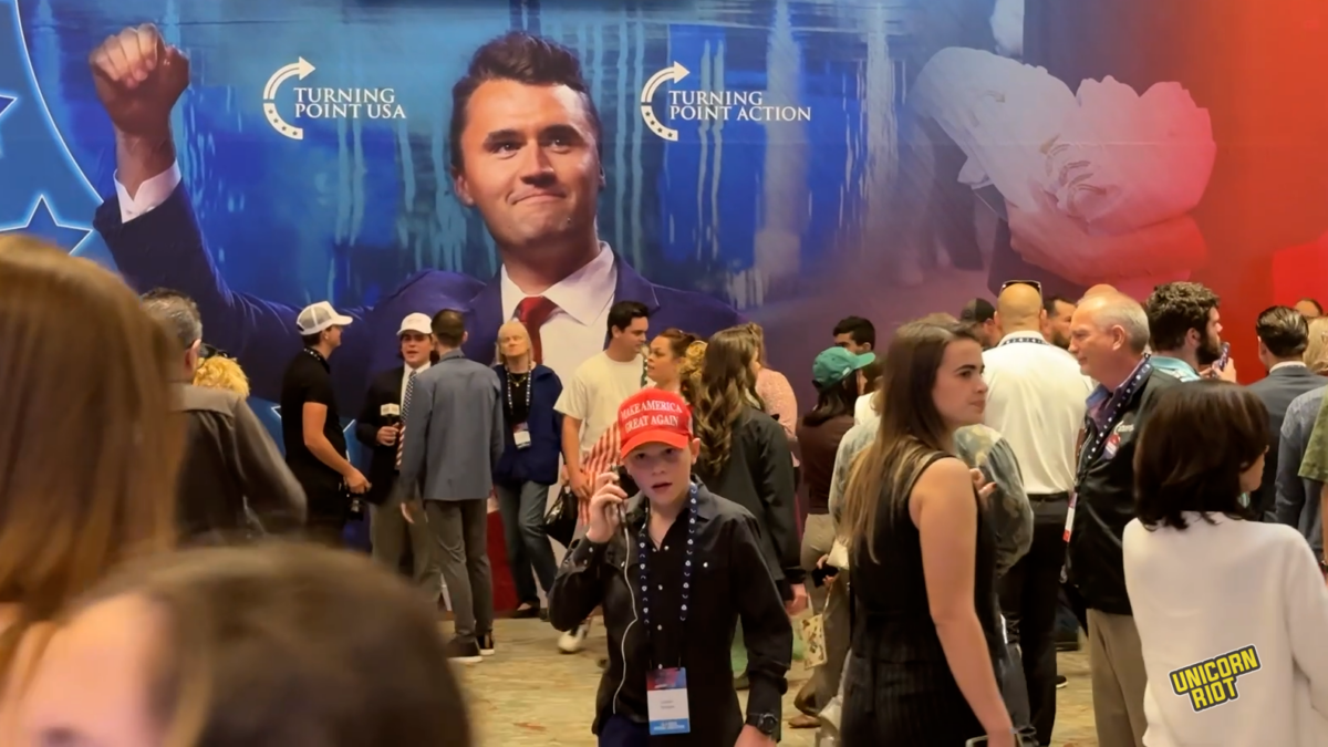 The walls were plastered with images of Charlie Kirk, Turning Point USA’s late founder who was fatally shot on September 10 at Utah Valley University. In some of the images, he’s stern. In others he’s smiling, his gums revealed like an angered primate flipping back its upper lip to bare its teeth.